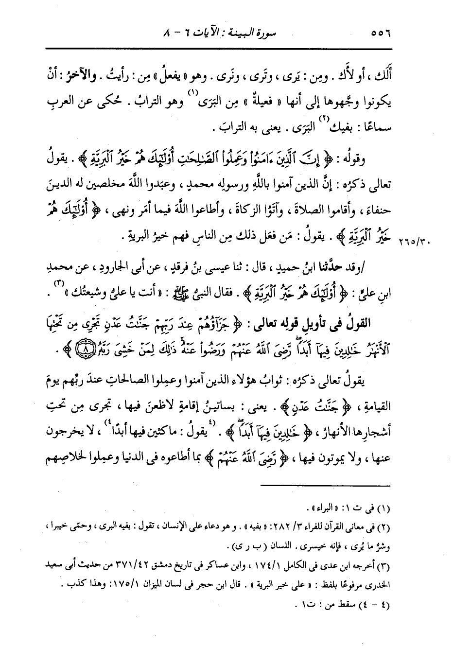 §الْقَوْلُ فِي تَأْوِيلِ قَوْلِهِ تَعَالَى: {جَزَاؤُهُمْ عِنْدَ رَبِّهِمْ جَنَّاتُ عَدْنٍ تَجْرِي مِنْ تَحْتِهَا الْأَنْهَارُ خَالِدِينَ فِيهَا أَبَدًا رَّضِيَ اللَّهُ عَنْهُمْ وَرَضُوا عَنْهُ ذَلِكَ لِمَنْ خَشِيَ رَبَّهُ} [البينة: 8] يَقُولُ تَعَالَى ذِكْرُهُ: ثَوَابُ هَؤُلَاءِ الَّذِينَ آمَنُوا وَعَمِلُوا الصَّالِحَاتِ {عِنْدَ رَبِّهِمْ} [البقرة: 62] يَوْمَ الْقِيَامَةِ {جَنَّاتُ عَدْنٍ} [التوبة: 72] يَعْنِي بَسَاتِينَ إِقَامَةٍ لَا ظَعْنَ فِيهَا، {تَجْرِي مِنْ} [البقرة: 25] تَحْتِ أَشْجَارِهَا الْأَنْهَارُ يَقُولُ: {خَالِدِينَ فِيهَا أَبَدًا} [النساء: 57] يقول: مَاكِثِينَ فِيهَا أَبَدًا، لَا يَخْرُجُونَ عَنْهَا، وَلَا يَمُوتُونَ فِيهَا {رَّضِيَ اللَّهُ عَنْهُمْ} [المائدة: 119] بِمَا أَطَاعُوهُ فِي الدُّنْيَا، وَعَمِلُوا لِخَلَاصِهِمْ -[557]- مِنْ عِقَابِهِ فِي ذَلِكَ {وَرَضُوا عَنْهُ} [المائدة: 119] بِمَا أَعْطَاهُمْ مِنَ الثَّوَابِ يَوْمَئِذٍ، عَلَى طَاعَتِهِمْ رَبَّهُمْ فِي الدُّنْيَا، وَجَزَاهُمْ عَلَيْهَا مِنَ الْكَرَامَةِ