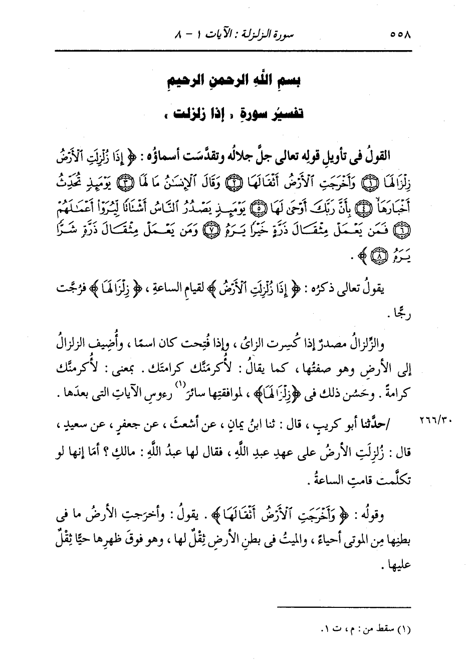 §الْقَوْلُ فِي تَأْوِيلِ قَوْلِهِ تَعَالَى: {إِذَا زُلْزِلَتِ الْأَرْضُ زِلْزَالَهَا وَأَخْرَجَتِ الْأَرْضُ أَثْقَالَهَا وَقَالَ الْإِنْسَانُ مَا لَهَا يَوْمَئِذٍ تُحَدِّثُ أَخْبَارَهَا بِأَنَّ رَبَّكَ أَوْحَى لَهَا يَوْمَئِذٍ يَصْدُرُ النَّاسُ أَشْتَاتًا لِيُرَوْا أَعْمَالَهُمْ فَمَنْ يَعْمَلْ مِثْقَالَ ذَرَّةٍ خَيْرًا يَرَهُ وَمَنْ يَعْمَلْ مِثْقَالَ ذَرَّةٍ شَرًّا يَرَهُ} [الزلزلة: 2] يَقُولُ تَعَالَى ذِكْرُهُ: {إِذَا زُلْزِلَتِ الْأَرْضُ} [الزلزلة: 1] لَقِيَامِ السَّاعَةِ {زِلْزَالَهَا} [الزلزلة: 1] فَرُجِّتْ رَجًّا؛ وَالزِّلْزَالُ: مَصْدَرٌ إِذَا كَسَرْتَ الزَّايَ، وَإِذَا فُتِحَتْ كَانَ اسْمًا؛ وَأُضِيفَ الزِّلْزَالُ إِلَى الْأَرْضِ وَهُوَ صِفَتُهَا، كَمَا يُقَالُ: لَأُكْرِمَنَّكَ كَرَامَتَكَ، بِمَعْنَى: لَأُكْرِمَنَّكَ كَرَامَةً. وَحَسُنَ ذَلِكَ فِي {زِلْزَالَهَا} [الزلزلة: 1] لِمُوَافَقَتِهَا رُءُوسَ الْآيَاتِ الَّتِي بَعْدَهَا