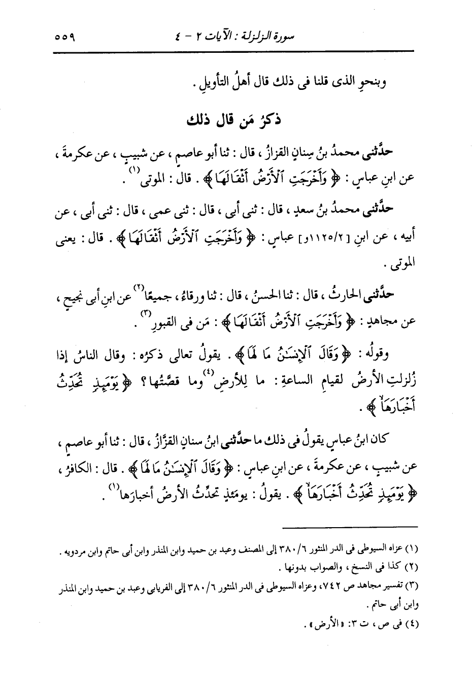 حَدَّثَنِي مُحَمَّدُ بْنُ سَعْدٍ، قَالَ: ثني أَبِي، قَالَ: ثني عَمِّي، قَالَ: ثني أَبِي، عَنْ أَبِيهِ، عَنِ ابْنِ عَبَّاسٍ {§وَأَخْرَجَتِ الْأَرْضُ أَثْقَالَهَا} [الزلزلة: 2] قَالَ: «يَعْنِي الْمَوْتَى»