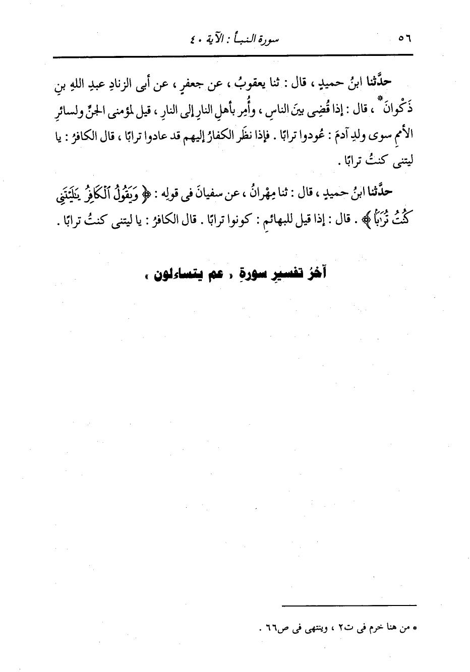 حَدَّثَنَا ابْنُ حُمَيْدٍ، قَالَ: ثنا مِهْرَانُ، عَنْ سُفْيَانَ، فِي قَوْلِهِ: {وَيَقُولُ الْكَافِرُ يَا لَيْتَنِي كُنْتُ تُرَابًا} [النبأ: 40] قَالَ: §إِذَا قِيلَ لِلْبَهَائِمِ: كُونُوا تُرَابًا، قَالَ الْكَافِرُ: يَا لَيْتَنِي كُنْتُ تُرَابًا