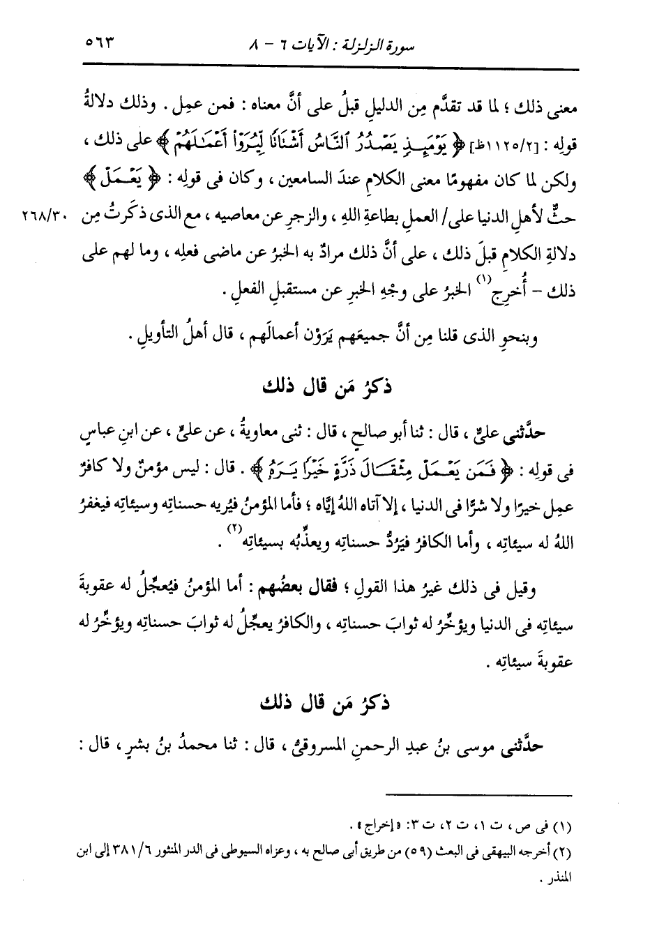 ذِكْرُ مَنْ قَالَ ذَلِكَ: حَدَّثَنِي مُوسَى بْنُ عَبْدِ الرَّحْمَنِ الْمَسْرُوقِيُّ، قَالَ: ثنا مُحَمَّدُ بْنُ بِشْرٍ، قَالَ: -[564]- حَدَّثَنِيهِ مُحَمَّدُ بْنُ مُسْلِمٍ الطَّائِفِيُّ، عَنْ عَمْرِو بْنِ قَتَادَةَ، قَالَ: سَمِعْتُ مُحَمَّدَ بْنَ كَعْبٍ الْقُرَظِيَّ، وَهُوَ يُفَسِّرُ هَذِهِ الْآيَةَ: {فَمَنْ يَعْمَلْ مِثْقَالَ ذَرَّةٍ} [الزلزلة: 7] قَالَ: " §مَنْ يَعْمَلْ مِثْقَالَ ذَرَّةٍ مِنْ خَيْرٍ مِنْ كَافِرٍ يَرَ ثَوَابَهُ فِي الدُّنْيَا فِي نَفْسِهِ وَأَهْلِهِ وَمَالِهِ وَوَلَدِهِ، حَتَّى يَخْرُجَ مِنَ الدُّنْيَا، وَلَيْسَ لَهُ عِنْدَهُ خَيْرٌ {وَمَنْ يَعْمَلْ مِثْقَالَ ذَرَّةٍ شَرًّا يَرَهُ} [الزلزلة: 8] مِنْ مُؤْمِنٍ يَرَ عُقُوبَتَهُ فِي الدُّنْيَا فِي نَفْسِهِ وَأَهْلِهِ وَمَالِهِ وَوَلَدِهِ، حَتَّى يَخْرُجَ مِنَ الدُّنْيَا وَلَيْسَ عِنْدَهُ شَيْءٌ