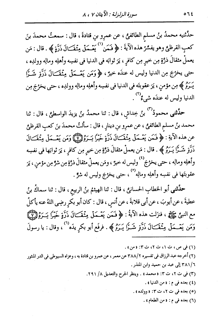 حَدَّثَنِي مَحْمُودُ بْنُ خِدَاشٍ، قَالَ: ثنا مُحَمَّدُ بْنُ يَزِيدَ الْوَاسِطِيُّ، قَالَ: ثنا مُحَمَّدُ بْنُ مُسْلِمٍ الطَّائِفِيُّ، عَنْ عَمْرِو بْنِ دِينَارٍ، قَالَ: سَأَلْتُ مُحَمَّدَ بْنَ كَعْبٍ الْقُرَظِيَّ، عَنْ هَذِهِ الْآيَةِ: {فَمَنْ يَعْمَلْ مِثْقَالَ ذَرَّةٍ خَيْرًا يَرَهُ وَمَنْ يَعْمَلْ مِثْقَالَ ذَرَّةٍ شَرًّا يَرَهُ} [الزلزلة: 8] قَالَ: «§مَنْ يَعْمَلْ مِثْقَالَ ذَرَّةٍ مِنْ خَيْرٍ مِنْ كَافِرٍ، يَرَ ثَوَابَهَا فِي نَفْسِهِ وَأَهْلِهِ وَمَالِهِ، حَتَّى يَخْرُجَ مِنَ الدُّنْيَا وَلَيْسَ لَهُ خَيْرٌ؛ وَمَنْ يَعْمَلْ مِثْقَالَ ذَرَّةٍ مِنْ شَرٍّ مِنْ مُؤْمِنٍ، يَرَ عُقُوبَتَهَا فِي نَفْسِهِ وَأَهْلِهِ وَمَالِهِ، حَتَّى يَخْرُجَ وَلَيْسَ لَهُ شَرٌّ»