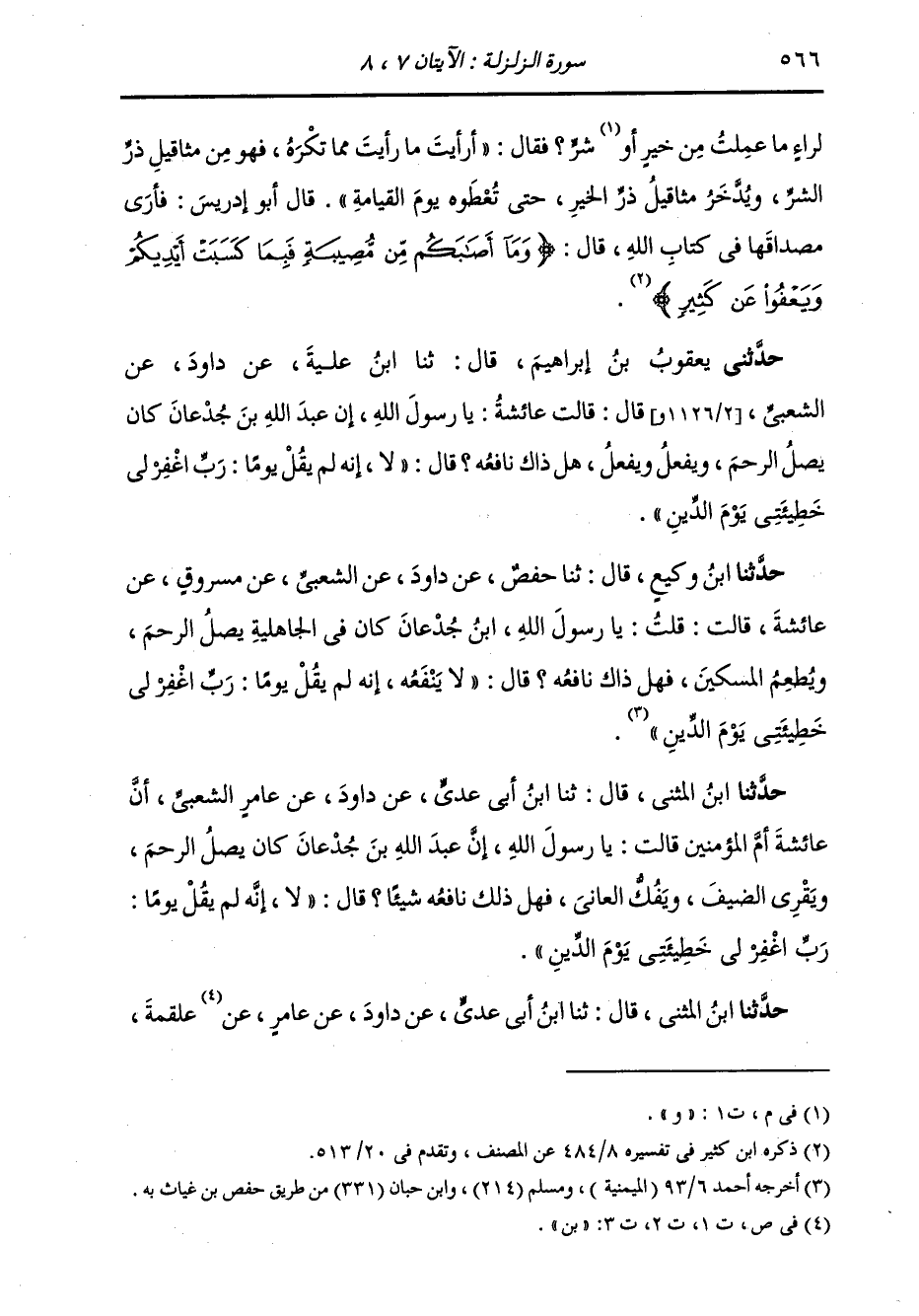 حَدَّثَنِي يَعْقُوبُ بْنُ إِبْرَاهِيمَ، قَالَ: ثنا ابْنُ عُلَيَّةَ، عَنْ دَاوُدَ، عَنِ الشَّعْبِيِّ، قَالَ: قَالَتْ عَائِشَةُ: يَا رَسُولَ اللَّهِ، إِنَّ §عَبْدَ اللَّهِ بْنَ جُدْعَانَ كَانَ يَصِلُ الرَّحِمَ، وَيَفْعَلُ وَيَفْعَلُ، هَلْ ذَاكَ نَافِعُهُ؟ قَالَ: " لَا، إِنَّهُ لَمْ يَقُلْ يَوْمًا: رَبِّ اغْفِرْ لِي خَطِيئَتِي يَوْمَ الدِّينِ "