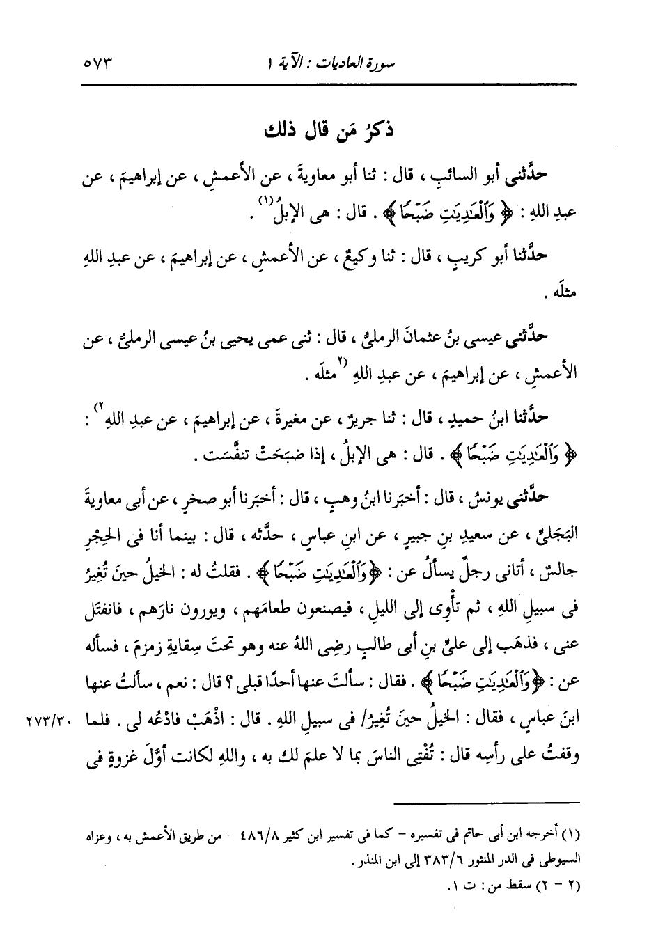 ذِكْرُ مَنْ قَالَ ذَلِكَ حَدَّثَنِي أَبُو السَّائِبِ، قَالَ: ثنا أَبُو مُعَاوِيَةَ، عَنِ الْأَعْمَشِ، عَنْ إِبْرَاهِيمَ، عَنْ عَبْدِ اللَّهِ، {§وَالْعَادِيَاتِ ضَبْحًا} [العاديات: 1] قَالَ: هِيَ الْإِبِلُ " حَدَّثَنَا أَبُو كُرَيْبٍ، قَالَ: ثنا وَكِيعٌ، عَنِ الْأَعْمَشِ، عَنْ إِبْرَاهِيمَ، عَنْ عَبْدِ اللَّهِ، مِثْلَهُ. حَدَّثَنِي عِيسَى بْنُ عُثْمَانَ الرَّمْلِيُّ، قَالَ: ثني عَمِّي يَحْيَى بْنُ عِيسَى الرَّمْلِيُّ، عَنِ الْأَعْمَشِ، عَنْ إِبْرَاهِيمَ، عَنْ عَبْدِ اللَّهِ، مِثْلَهُ