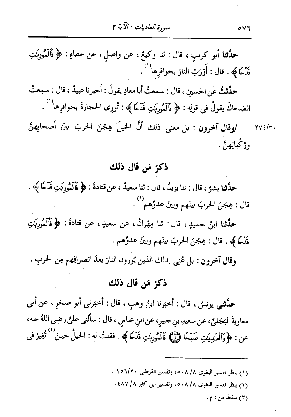 ذِكْرُ مَنْ قَالَ ذَلِكَ حَدَّثَنِي يُونُسُ، قَالَ: أَخْبَرَنَا ابْنُ وَهْبٍ، قَالَ: أَخْبَرَنِي أَبُو صَخْرٍ، عَنْ أَبِي مُعَاوِيَةَ الْبَجَلِيِّ، عَنْ سَعِيدِ بْنِ جُبَيْرٍ، عَنِ ابْنِ عَبَّاسٍ، قَالَ: سَأَلَنِي عَلِيُّ بْنُ أَبِي طَالِبٍ رِضَى اللَّهُ عَنْهُ، عَنِ {§الْعَادِيَاتِ ضَبْحًا} [العاديات: 1] {فَالْمُورِيَاتِ قَدْحًا} [العاديات: 2] فَقُلْتُ لَهُ: الْخَيْلُ تُغِيرُ فِي -[577]- سَبِيلِ اللَّهِ، ثُمَّ تَأْوِي إِلَى اللَّيْلِ، فَيَصْنَعُونَ طَعَامَهُمْ وَيُورُونَ نَارَهُمْ " وَقَالَ آخَرُونَ: بَلْ مَعْنَى ذَلِكَ: مَكْرُ الرِّجَالِ