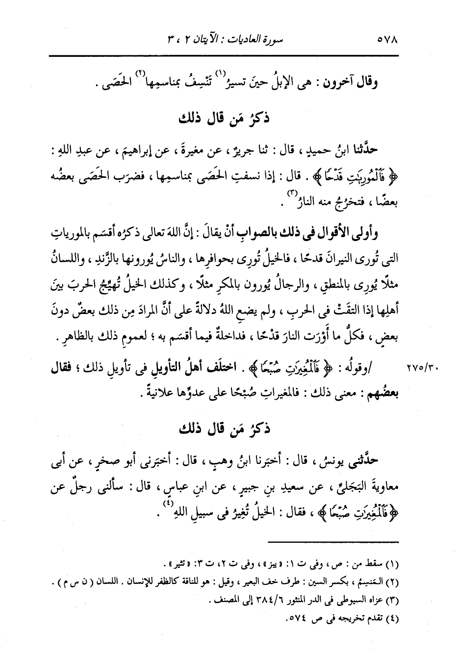 ذِكْرُ مَنْ قَالَ ذَلِكَ حَدَّثَنَا ابْنُ حُمَيْدٍ، قَالَ: ثنا جَرِيرٌ، عَنْ مُغِيرَةَ، عَنْ إِبْرَاهِيمَ، عَنْ عَبْدِ اللَّهِ: {§فَالْمُورِيَاتِ قَدْحًا} [العاديات: 2] قَالَ: إِذَا نَسَفَتِ الْحَصَى بِمَنَاسِمِهَا، فَضَرَبَ الْحَصَى بَعْضُهُ بَعْضًا، فَيَخْرُجُ مِنْهُ النَّارُ " وَأَوْلَى الْأَقْوَالِ فِي ذَلِكَ بِالصَّوَابِ: أَنْ يُقَالَ: إِنَّ اللَّهَ تَعَالَى ذِكْرُهُ أَقْسَمَ بِالْمُورِيَاتِ الَّتِي تُورِي النِّيرَانَ قَدْحًا؛ فَالْخَيْلُ تُورِي بِحَوَافِرِهَا، وَالنَّاسُ يُورُونَهَا بِالزَّنْدِ، وَاللِّسَانُ مَثَلًا يُورِي بِالْمَنْطِقِ، وَالرِّجَالُ يُورُونَ بِالْمَكْرِ مَثَلًا، وَكَذَلِكَ الْخَيْلُ تَهِيجُ الْحَرْبَ بَيْنَ أَهْلِهَا: إِذَا الْتَقَتْ فِي الْحَرْبِ؛ وَلَمْ يَضَعِ اللَّهُ دَلَالَةً عَلَى أَنَّ الْمُرَادَ مِنْ ذَلِكَ بَعْضٌ دُونَ بَعْضٍ فَكُلُّ مَا أَوْرَتِ النَّارُ قَدْحًا، فَدَاخِلَةٌ فِيمَا أَقْسَمَ بِهِ، لِعُمُومِ ذَلِكَ بِالظَّاهِرِ