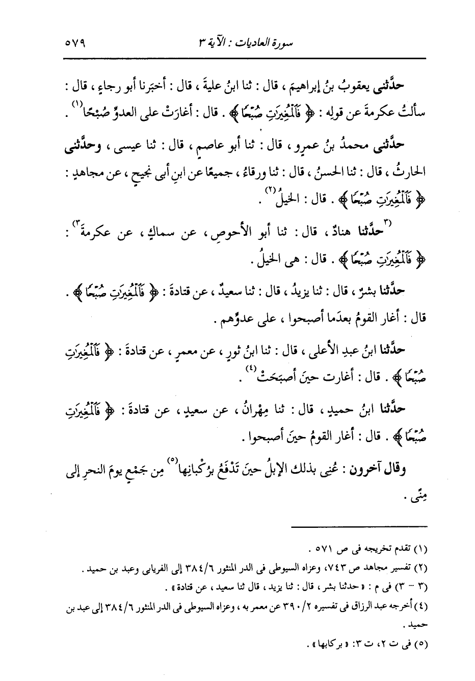 حَدَّثَنَا ابْنُ حُمَيْدٍ، قَالَ: ثنا مِهْرَانُ، عَنْ سَعِيدٍ، عَنْ قَتَادَةَ: " {§فَالْمُغِيرَاتِ صُبْحًا} [العاديات: 3] قَالَ: أَغَارَ الْقَوْمُ حِينَ أَصْبَحُوا " وَقَالَ آخَرُونَ: عُنِيَ بِذَلِكَ الْإِبِلُ حِينَ تَدْفَعُ بِرُكْبَانِهَا مِنْ جَمْعٍ يَوْمَ النَّحْرِ إِلَى مِنًى.