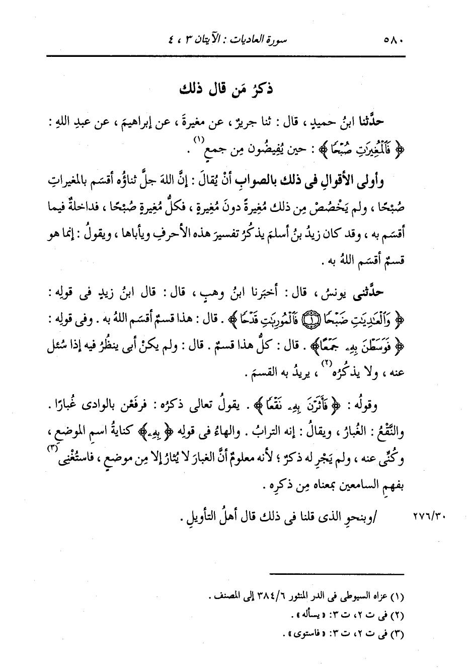 ذِكْرُ مَنْ قَالَ ذَلِكَ حَدَّثَنَا ابْنُ حُمَيْدٍ، قَالَ: ثنا جَرِيرٌ، عَنْ مُغِيرَةَ، عَنْ إِبْرَاهِيمَ، عَنْ عَبْدِ اللَّهِ: " {§فَالْمُغِيرَاتِ صُبْحًا} [العاديات: 3] حِينَ يُفِيضُونَ مِنْ جَمْعٍ " وَأَوْلَى الْأَقْوَالِ فِي ذَلِكَ بِالصَّوَابِ: أَنْ يُقَالَ: إِنَّ اللَّهَ جَلَّ ثَنَاؤُهُ أَقْسَمَ بِالْمُغِيرَاتِ صُبْحًا، وَلَمْ يُخَصِّصْ مِنْ ذَلِكَ مُغِيرَةً دُونَ مُغِيرَةٍ، فَكُلُّ مُغِيرَةٍ صُبْحًا، فَدَاخِلَةٌ فِيمَا أَقْسَمَ بِهِ؛ وَقَدْ كَانَ زَيْدُ بْنُ أَسْلَمَ يَذْكُرُ تَفْسِيرَ هَذِهِ الْأَحْرُفِ وَيَأْبَاهَا، وَيَقُولُ: إِنَّمَا هُوَ قَسَمٌ أَقْسَمَ اللَّهُ بِهِ