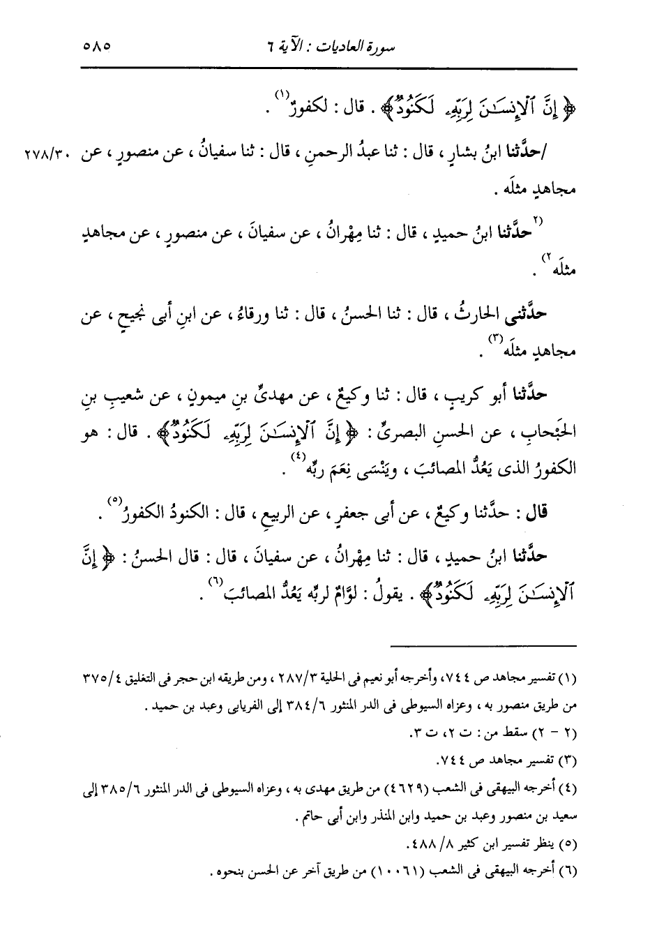 حَدَّثَنَا ابْنُ حُمَيْدٍ، قَالَ: ثنا مِهْرَانُ، عَنْ سُفْيَانَ، قَالَ: قَالَ الْحَسَنُ: {إِنَّ الْإِنْسَانَ §لِرَبِّهِ لَكَنُودٌ} [العاديات: 6] يَقُولُ: «لَوَّامٌ لِرَبِّهِ يَعُدُّ الْمَصَائِبَ»