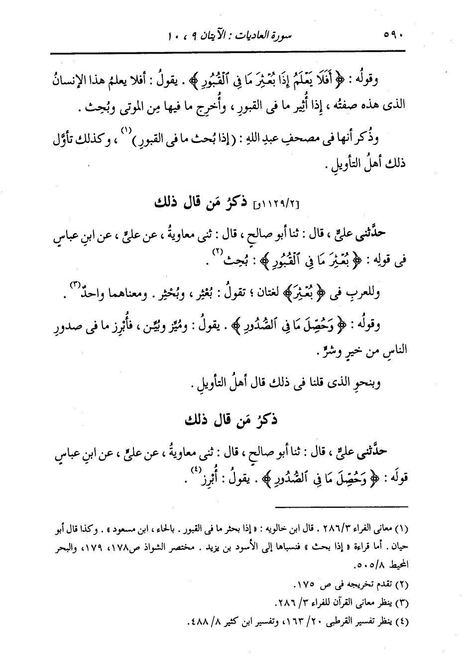 ذِكْرُ مَنْ قَالَ ذَلِكَ حَدَّثَنِي عَلِيٌّ، قَالَ: ثنا أَبُو صَالِحٍ، قَالَ: ثني مُعَاوِيَةُ، عَنْ عَلِيٍّ، عَنِ ابْنِ عَبَّاسٍ، فِي قَوْلِهِ: {§بُعْثِرَ مَا فِي الْقُبُورِ} [العاديات: 9] «بُحِثَ» وَلِلْعَرَبِ فِي بُعْثِرَ لُغَتَانِ: تَقُولُ: بُعْثِرَ، وَبُحْثِرَ، وَمَعْنَاهُمَا وَاحِدٌ