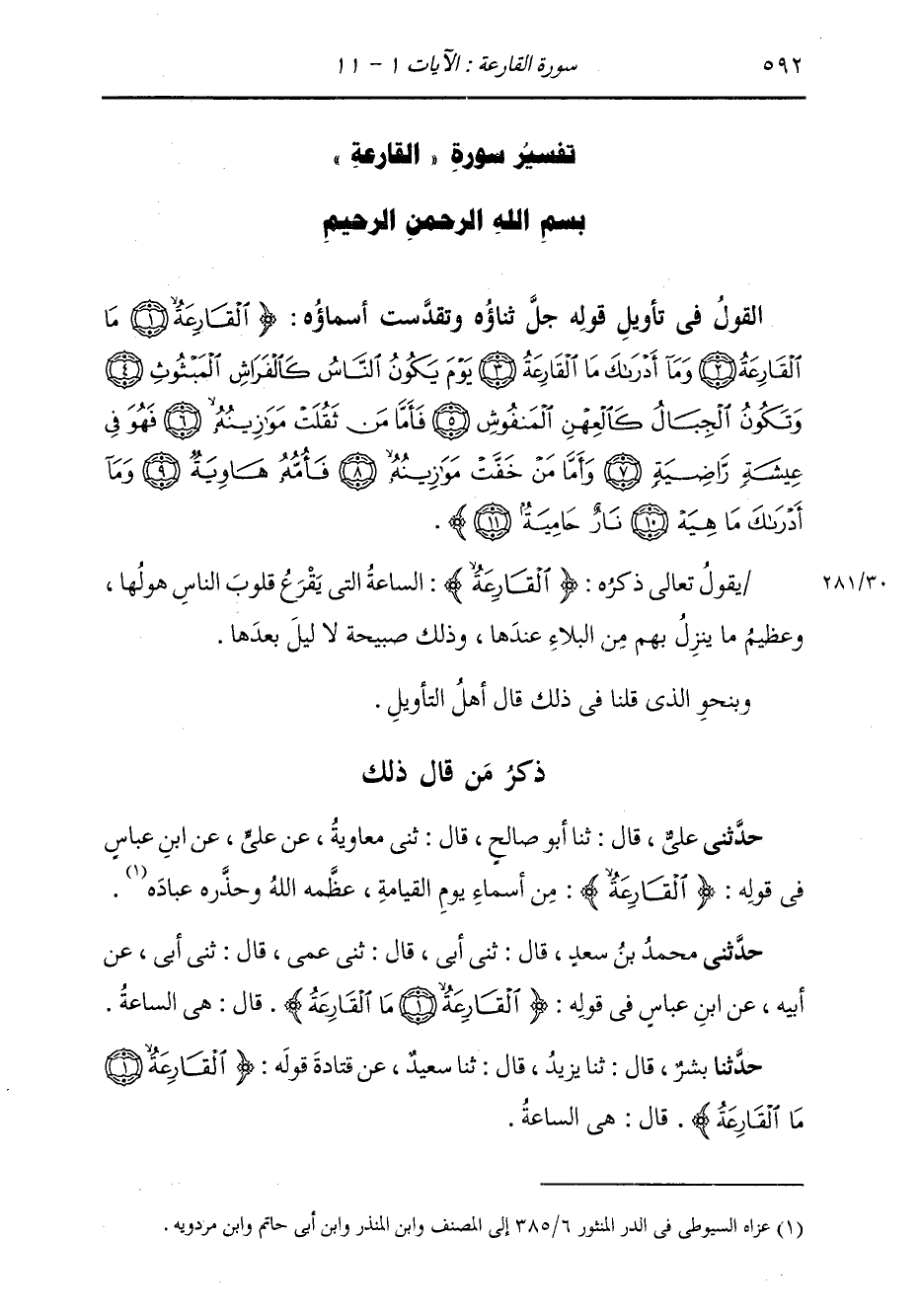 ذِكْرُ مَنْ قَالَ ذَلِكَ حَدَّثَنِي عَلِيٌّ، قَالَ: ثنا أَبُو صَالِحٍ، قَالَ: ثني مُعَاوِيَةُ، عَنْ عَلِيٍّ، عَنِ ابْنِ عَبَّاسٍ، فِي قَوْلِهِ: " {§الْقَارِعَةُ} [القارعة: 1] «مِنْ أَسْمَاءِ يَوْمِ الْقِيَامَةِ، عَظَّمَهُ اللَّهُ وَحَذَّرَهُ عِبَادَهُ»