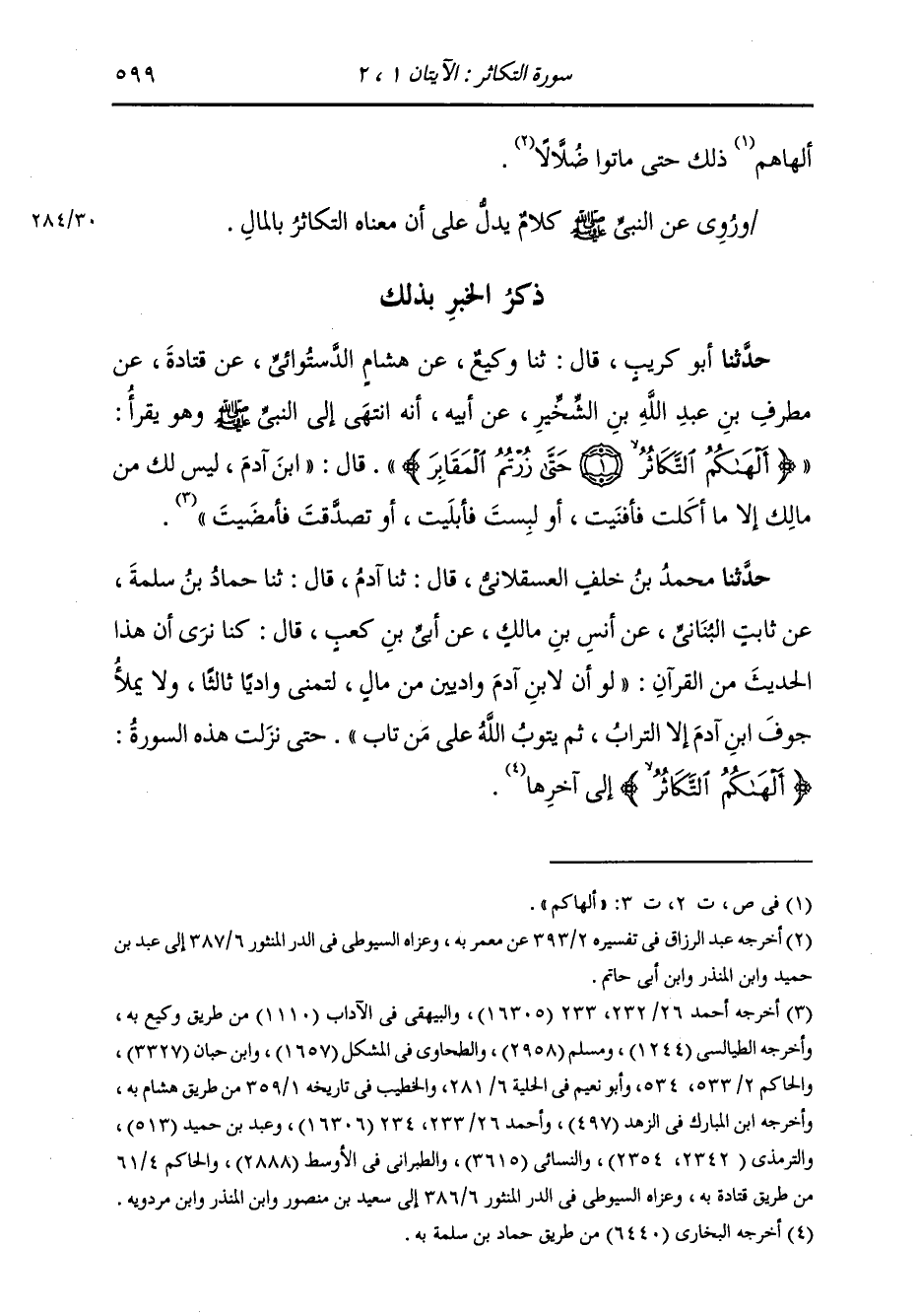 ذِكْرُ الْخَبَرِ بِذَلِكَ حَدَّثَنَا أَبُو كُرَيْبٍ، قَالَ: ثنا وَكِيعٌ، عَنْ هِشَامٍ الدَّسْتُوَائِيِّ، عَنْ قَتَادَةَ، عَنْ مُطَرِّفِ بْنِ عَبْدِ اللَّهِ بْنِ الشِّخِّيرِ، عَنْ أَبِيهِ، أَنَّهُ انْتَهَى إِلَى النَّبِيِّ صَلَّى اللهُ عَلَيْهِ وَسَلَّمَ، وَهُوَ يَقْرَأُ: {أَلْهَاكُمُ التَّكَاثُرُ حَتَّى زُرْتُمُ الْمَقَابِرَ} [التكاثر: 2] قَالَ: «§ابْنَ آدَمَ، لَيْسَ لَكَ مِنْ مَالِكِ إِلَّا مَا أَكَلْتَ فَأَفْنَيْتَ، أَوْ لَبِسْتَ فَأَبْلَيْتَ، أَوْ تَصَدَّقْتَ فَأَمْضَيْتَ»
