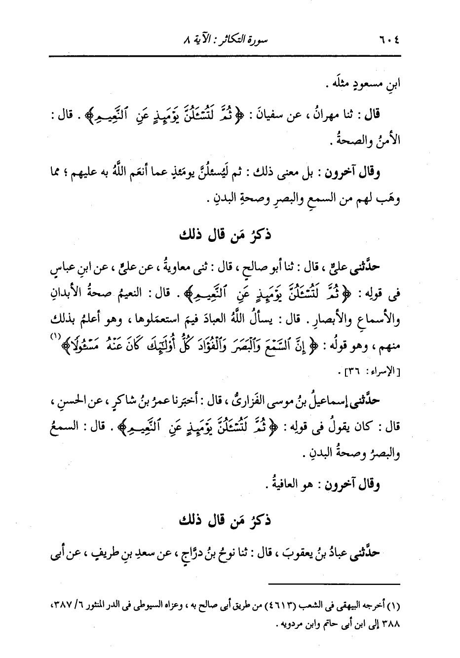 ذِكْرُ مَنْ قَالَ ذَلِكَ حَدَّثَنِي عَلِيٌّ، قَالَ: ثنا أَبُو صَالِحٍ، قَالَ: ثني مُعَاوِيَةُ، عَنْ عَلِيٍّ، عَنِ ابْنِ عَبَّاسٍ، فِي قَوْلِهِ: " {§ثُمَّ لَتُسْأَلُنَّ يَوْمَئِذٍ عَنِ النَّعِيمِ} [التكاثر: 8] قَالَ: النَّعِيمُ: صِحَّةُ الْأَبْدَانِ وَالْأَسْمَاعِ وَالْأَبْصَارِ، قَالَ: يَسْأَلُ اللَّهُ الْعِبَادَ فِيمَ اسْتَعْمَلُوهَا، وَهُوَ أَعْلَمُ بِذَلِكَ مِنْهُمْ، وَهُوَ قَوْلُهُ: {إِنَّ السَّمْعَ وَالْبَصَرَ وَالْفُؤَادَ كُلُّ أُولَئِكَ كَانَ عَنْهُ مَسْئُولًا} "