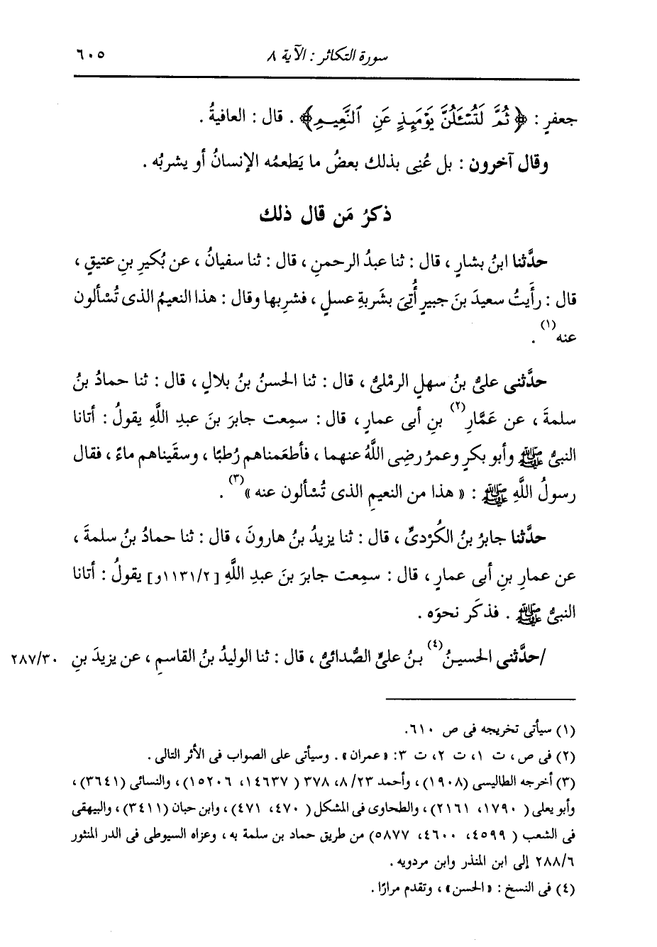 ذِكْرُ مَنْ قَالَ ذَلِكَ حَدَّثَنَا ابْنُ بَشَّارٍ، قَالَ ثنا عَبْدُ الرَّحْمَنِ، قَالَ: ثنا سُفْيَانُ، عَنْ بُكَيْرِ بْنِ عَتِيقٍ، قَالَ: رَأَيْتُ سَعِيدَ بْنَ جُبَيْرٍ §أُتِيَ بِشَرْبَةِ عَسَلٍ، فَشَرِبَهَا، وَقَالَ: هَذَا النَّعِيمُ الَّذِي تُسْأَلُونَ عَنْهُ "
