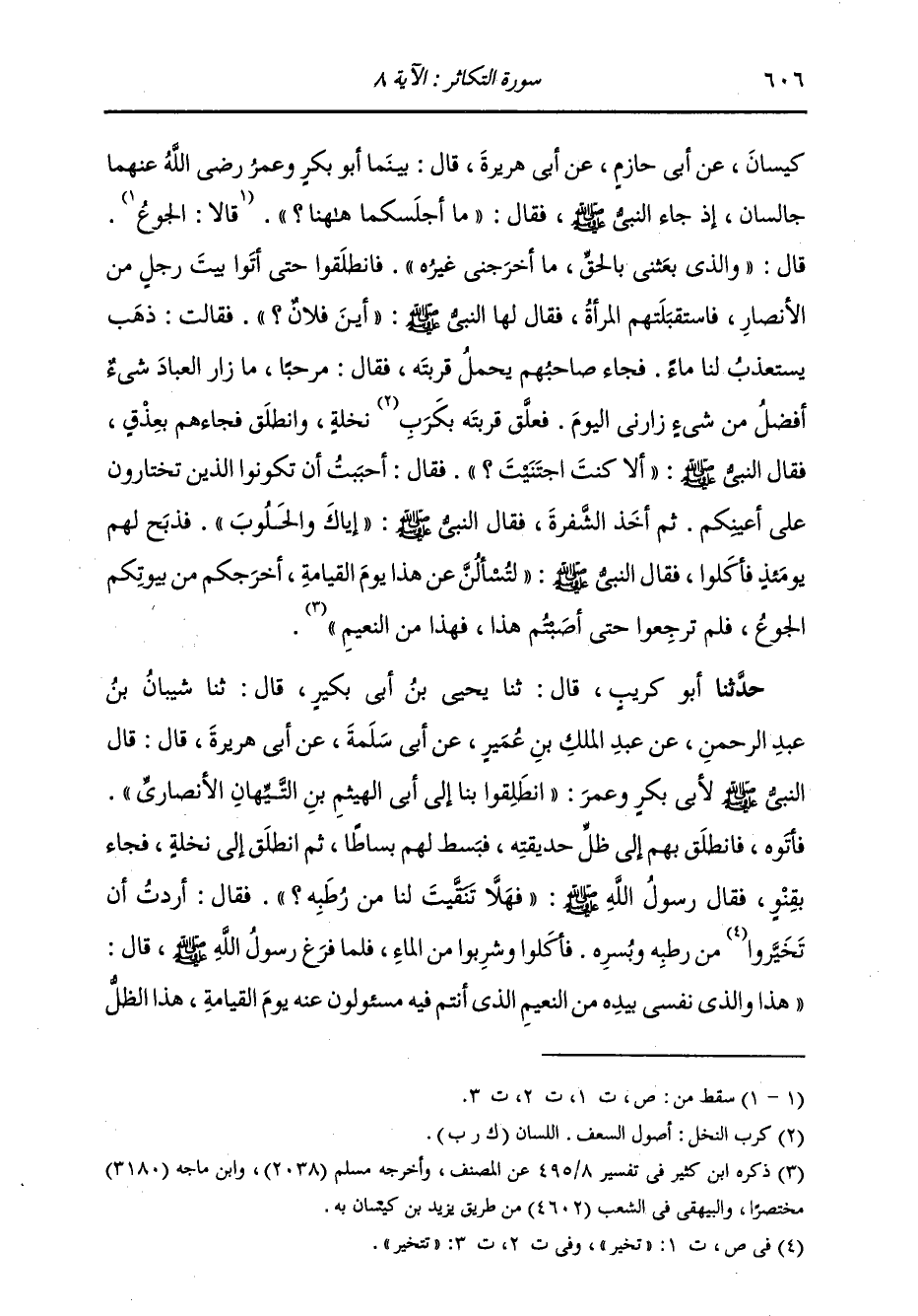 حَدَّثَنَا أَبُو كُرَيْبٍ، قَالَ: ثنا يَحْيَى بْنُ أَبِي بُكَيْرٍ، قَالَ ثنا شَيْبَانُ بْنُ عَبْدِ الرَّحْمَنِ، عَنْ عَبْدِ الْمَلِكِ بْنِ عُمَيْرٍ، عَنْ أَبِي سَلَمَةَ، عَنْ أَبِي هُرَيْرَةَ، قَالَ: قَالَ النَّبِيُّ صَلَّى اللهُ عَلَيْهِ وَسَلَّمَ لِأَبِي بَكْرٍ وَعُمَرَ: «انْطَلِقُوا بِنَا إِلَى أَبِي الْهَيْثَمِ بْنِ التَّيْهَانِ الْأَنْصَارِيِّ» ، فَانْطَلَقَ بِهِمْ إِلَى ظِلِّ حَدِيقَتِهِ، فَبَسَطَ لَهُمْ بِسَاطًا، ثُمَّ انْطَلَقَ إِلَى نَخْلَةٍ، فَجَاءَ بِقِنْوٍ، فَقَالَ رَسُولُ اللَّهِ صَلَّى اللهُ عَلَيْهِ وَسَلَّمَ: «فَهَلَّا تَنَقَّيْتَ لَنَا مِنْ رُطَبِهِ؟» فَقَالَ: أَرَدْتُ أَنْ تُخَيِّرُوا مِنْ رُطَبِهِ وَبُسْرِهِ، فَأَكَلُوا وَشَرِبُوا مِنَ الْمَاءِ؛ فَلَمَّا فَرَغَ رَسُولُ اللَّهِ صَلَّى اللهُ عَلَيْهِ وَسَلَّمَ، قَالَ: «هَذَا وَالَّذِي نَفْسِي بِيَدِهِ مِنَ النَّعِيمِ، الَّذِي أَنْتُمْ فِيهِ §مَسْئُولُونَ عَنْهُ يَوْمَ الْقِيَامَةِ، هَذَا الظِّلُّ -[607]- الْبَارِدُ، وَالرُّطَبُ الْبَارِدُ، عَلَيْهِ الْمَاءُ الْبَارِدُ» حَدَّثَنِي صَالِحُ بْنُ مِسْمَارٍ الْمَرْوَزِيُّ، قَالَ: ثنا آدَمُ بْنُ أَبِي إِيَاسٍ، قَالَ: ثنا شَيْبَانُ، قَالَ: ثنا عَبْدُ الْمَلِكِ بْنُ عُمَيْرٍ، عَنْ أَبِي سَلَمَةَ بْنِ عَبْدِ الرَّحْمَنِ، عَنْ أَبِي هُرَيْرَةَ، عَنْ رَسُولِ اللَّهِ صَلَّى اللهُ عَلَيْهِ وَسَلَّمَ بِنَحْوِهِ، إِلَّا أَنَّهُ قَالَ فِي حَدِيثِهِ: «ظِلٌّ بَارِدٌ، وَرُطَبٌ بَارِدٌ، وَمَاءٌ بَارِدٌ»
