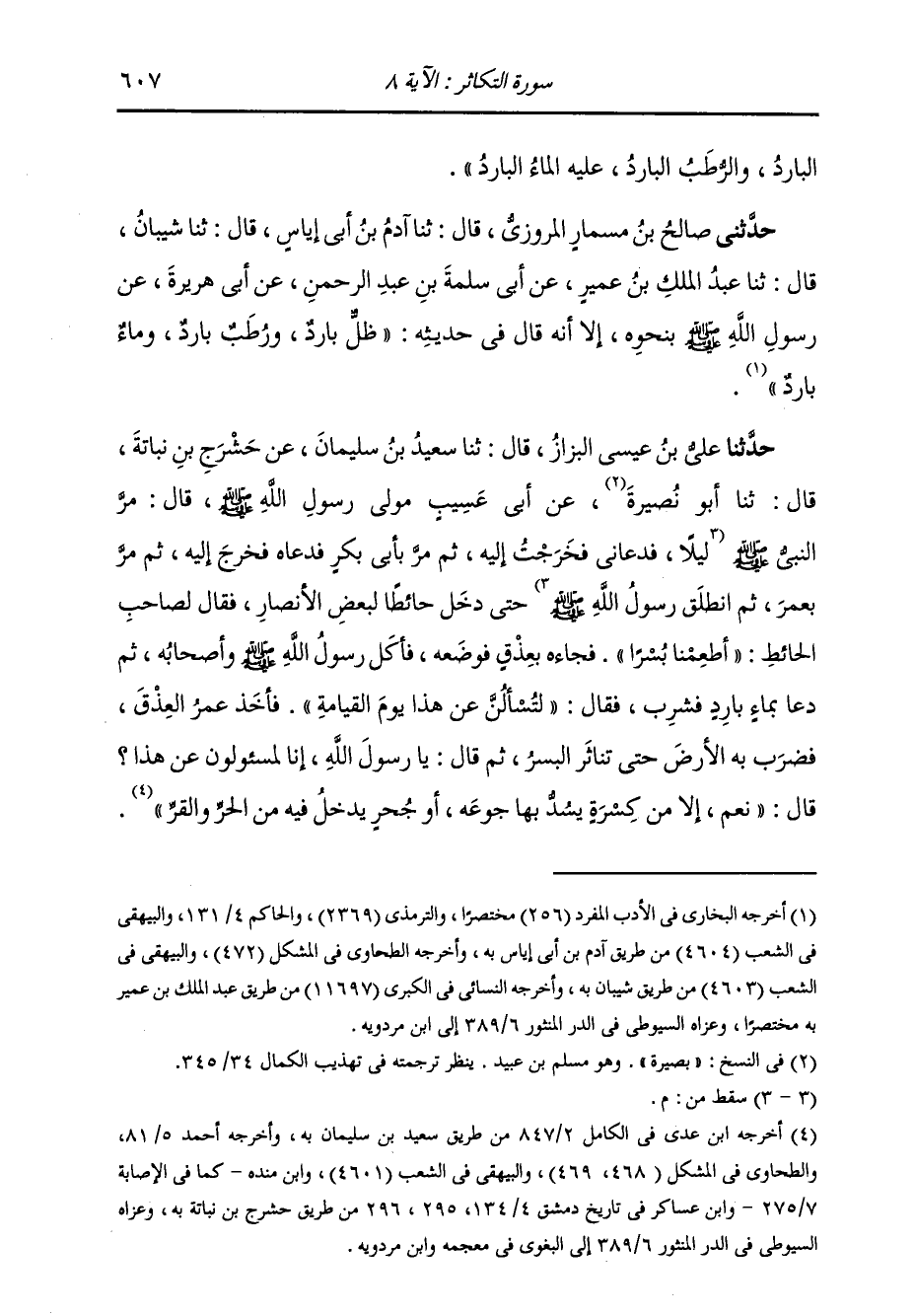 حَدَّثَنَا عَلِيُّ بْنُ عِيسَى الْبَزَّازُ، قَالَ: ثنا سَعِيدُ بْنُ سُلَيْمَانَ، عَنْ حَشْرَجِ بْنِ نُبَاتَةَ، قَالَ: ثنا أَبُو نُصَيْرَةَ، عَنْ أَبِي عَسِيبٍ مَوْلَى رَسُولِ اللَّهِ صَلَّى اللهُ عَلَيْهِ وَسَلَّمَ، قَالَ: مَرَّ النَّبِيُّ صَلَّى اللهُ عَلَيْهِ وَسَلَّمَ حَتَّى دَخَلَ حَائِطًا لِبَعْضِ الْأَنْصَارِ، فَقَالَ لِصَاحِبِ الْحَائِطِ: «أَطْعِمْنَا بُسْرًا» فَجَاءَ بِعِذْقٍ فَوَضَعَهُ فَأَكَلَ رَسُولُ اللَّهِ صَلَّى اللهُ عَلَيْهِ وَسَلَّمَ وَأَصْحَابُهُ، ثُمَّ §دَعَا بِمَاءٍ بَارِدٍ فَشَرِبَ، فَقَالَ: «لَتُسْأَلُنَّ عَنْ هَذَا يَوْمِ الْقِيَامَةِ» فَأَخَذَ عُمَرُ الْعِذْقَ، فَضَرَبَ بِهِ الْأَرْضِ، حَتَّى تَنَاثَرَ الْبُسْرُ، ثُمَّ قَالَ: يَا رَسُولَ اللَّهِ، إِنَّا لَمَسْئُولُونَ عَنْ هَذَا؟ قَالَ: «نَعَمْ، إِلَّا مِنْ كِسْرَةٍ يَسُدُّ بِهَا جُوعَهُ، أَوْ حَجَرٍ يَدْخُلُ فِيهِ مِنَ الْحَرِّ وَالْقُرِّ»