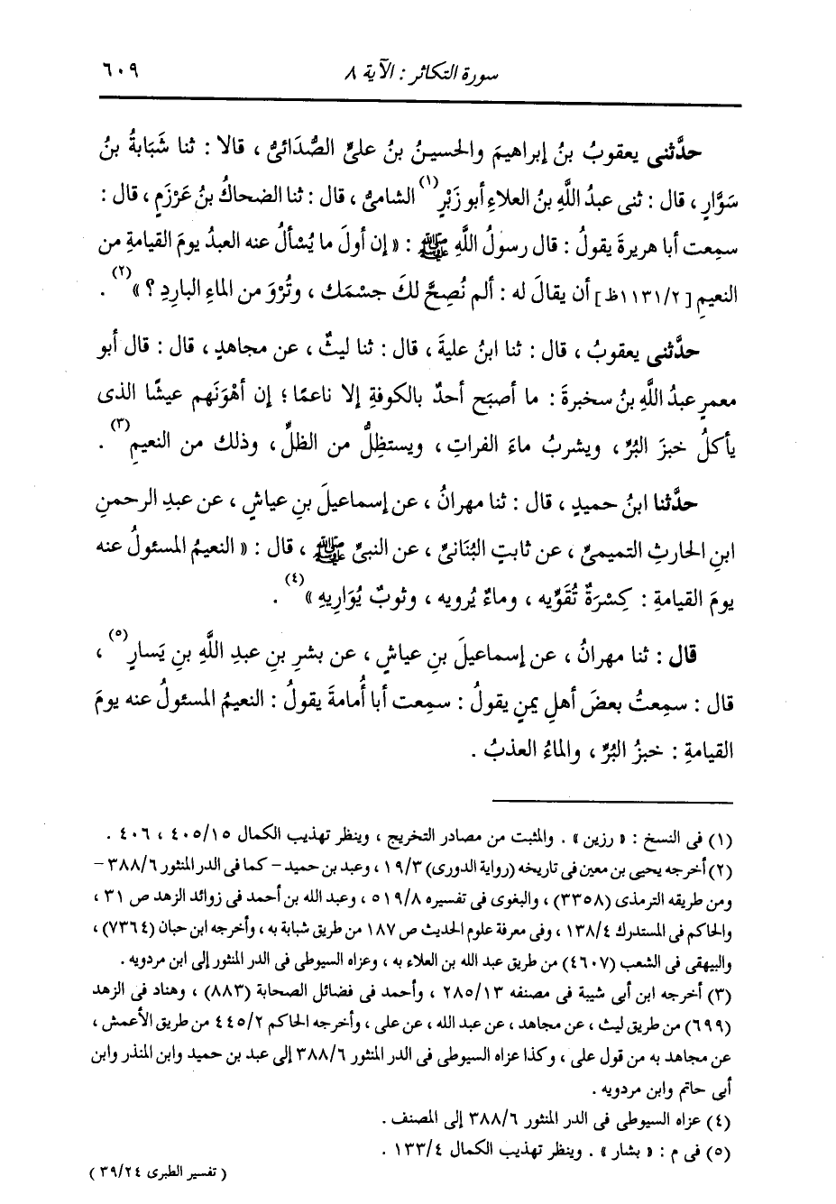 حَدَّثَنَا ابْنُ حُمَيْدٍ، قَالَ: ثنا مِهْرَانُ، عَنْ إِسْمَاعِيلَ بْنِ عَيَّاشٍ، عَنْ عَبْدِ الرَّحْمَنِ بْنِ الْحَارِثِ التَّمِيمِيِّ، عَنْ ثَابِتٍ الْبُنَانِيِّ، عَنِ النَّبِيِّ صَلَّى اللهُ عَلَيْهِ وَسَلَّمَ قَالَ: " §النَّعِيمُ الْمَسْئُولُ عَنْهُ يَوْمَ الْقِيَامَةِ: كِسْرَةُ تُقَوِّيهِ، وَمَاءٌ يَرْوِيهِ، وَثَوْبٌ يُوَارِيهِ "