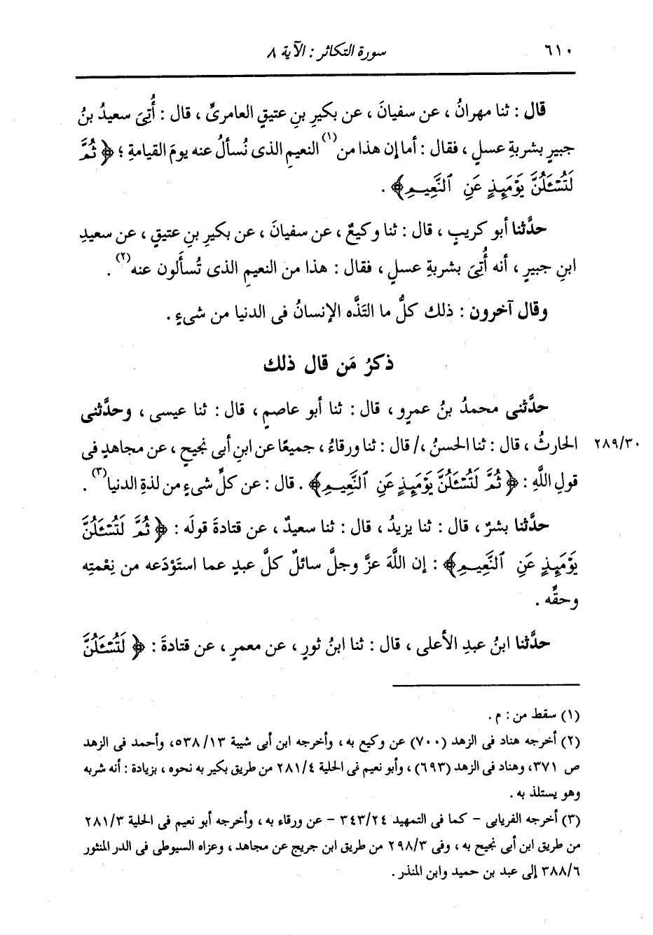 قَالَ: ثنا مِهْرَانُ، عَنْ سُفْيَانَ، عَنْ بُكَيْرِ بْنِ عَتِيقٍ الْعَامِرِيِّ، قَالَ: أُتِيَ سَعِيدُ بْنُ جُبَيْرٍ §بِشَرْبَةِ عَسَلٍ، فَقَالَ: " أَمَا إِنَّ هَذَا النَّعِيمُ الَّذِي نُسْأَلُ عَنْهُ يَوْمَ الْقِيَامَةِ {ثُمَّ لَتُسْأَلُنَّ يَوْمَئِذٍ عَنِ النَّعِيمِ} [التكاثر: 8] "