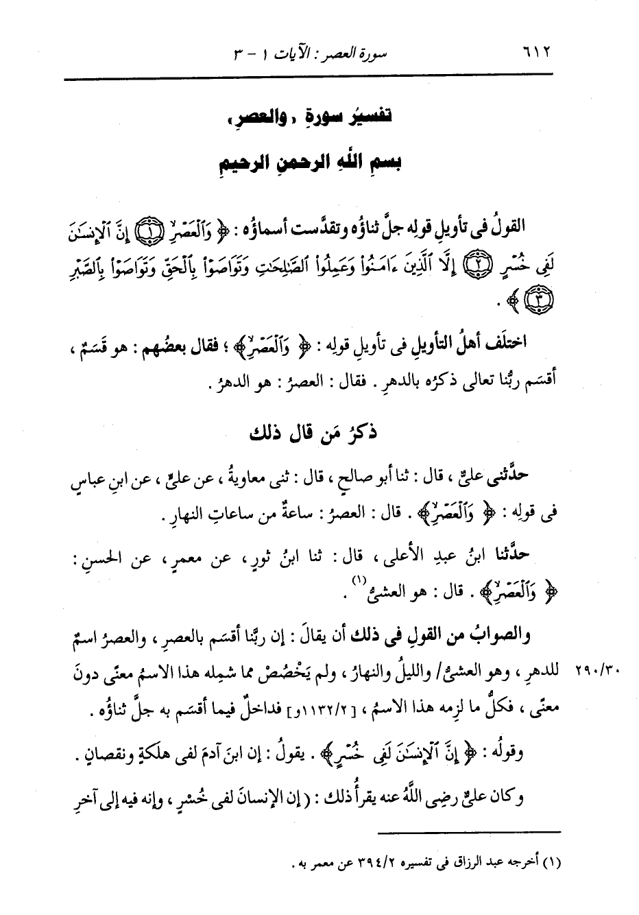§الْقَوْلُ فِي تَأْوِيلِ قَوْلِهِ تَعَالَى: {وَالْعَصْرِ إِنَّ الْإِنْسَانَ لَفِي خُسْرٍ إِلَّا الَّذِينَ آمَنُوا وَعَمِلُوا الصَّالِحَاتِ وَتَوَاصَوْا بِالْحَقِّ وَتَوَاصَوْا بِالصَّبْرِ} [العصر: 2] اخْتَلَفَ أَهْلُ التَّأْوِيلِ فِي تَأْوِيلِ قَوْلِهِ: {وَالْعَصْرِ} [العصر: 1] فَقَالَ بَعْضُهُمْ: هُوَ قَسَمٌ أَقْسَمَ رَبُّنَا تَعَالَى ذِكْرُهُ بِالدَّهْرِ، فَقَالَ: الْعَصْرُ: هُوَ الدَّهْرُ