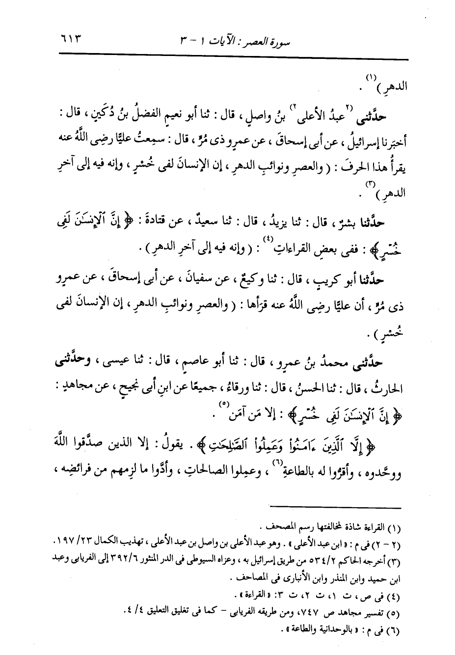حَدَّثَنِي عَبْدُ الْأَعْلَى بْنُ وَاصِلٍ، قَالَ: ثنا أَبُو نُعَيْمٍ الْفَضْلُ بْنُ دُكَيْنٍ، قَالَ: أَخْبَرَنَا إِسْرَائِيلُ، عَنْ أَبِي إِسْحَاقَ، عَنْ عَمْرٍو ذِي مَرٍّ، قَالَ: سَمِعْتُ عَلِيًّا، رَضِيَ اللَّهُ عَنْهُ يَقْرَأُ هَذَا الْحَرْفَ: «§وَالْعَصْرِ وَنَوَائِبِ الدَّهْرِ، إِنَّ الْإِنْسَانَ لَفِي خُسْرٍ، وَإِنَّهُ فِيهِ إِلَى آخِرِ الدَّهْرِ»