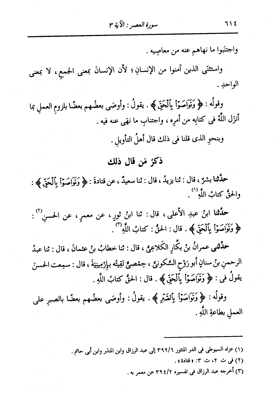 ذِكْرُ مَنْ قَالَ ذَلِكَ حَدَّثَنَا بِشْرٌ، قَالَ: ثنا يَزِيدُ، قَالَ: ثنا سَعِيدٌ، عَنْ قَتَادَةَ، {§وَتَوَاصَوْا بِالْحَقِّ} [العصر: 3] " وَالْحَقُّ: كِتَابُ اللَّهِ "