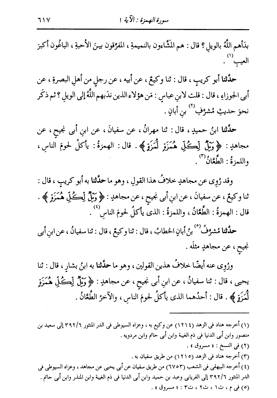 حَدَّثَنَا بِهِ أَبُو كُرَيْبٍ، قَالَ: ثنا وَكِيعٌ، عَنْ سُفْيَانَ، عَنِ ابْنِ أَبِي نَجِيحٍ، عَنْ مُجَاهِدٍ، {وَيْلٌ لِكُلِّ هُمَزَةٍ} [الهمزة: 1] قَالَ: " §الْهُمَزَةُ: الطَّعَّانُ، وَاللُّمَزَةُ: الَّذِي يَأْكُلُ لُحُومَ النَّاسِ " حَدَّثَنَا مَسْرُوقُ بْنُ أَبَانَ الْحَطَّابُ، قَالَ: ثنا وَكِيعٌ، قَالَ: ثنا سُفْيَانُ، عَنِ ابْنِ أَبِي نَجِيحٍ، عَنْ مُجَاهِدٍ، مِثْلَهُ وَرُوِيَ عَنْهُ أَيْضًا خِلَافُ هَذَيْنِ الْقَوْلَيْنِ، وَهُوَ مَا