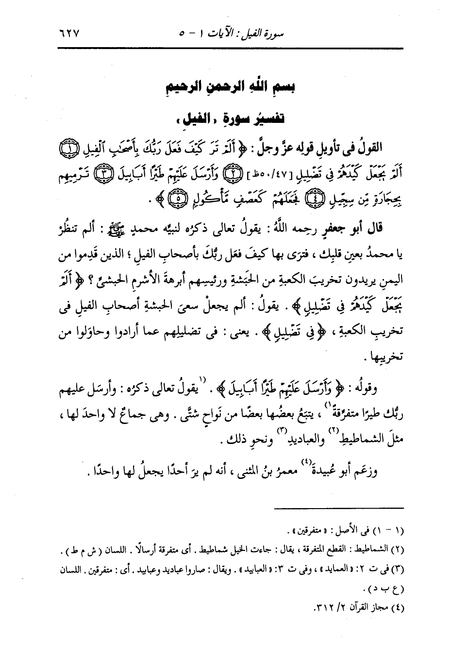 §الْقَوْلُ فِي تَأْوِيلِ قَوْلِهِ تَعَالَى: {أَلَمْ تَرَ كَيْفَ فَعَلَ رَبُّكَ بِأَصْحَابِ الْفِيلِ أَلَمْ يَجْعَلْ كَيْدَهُمْ فِي تَضْلِيلٍ وَأَرْسَلَ عَلَيْهِمْ طَيْرًا أَبَابِيلَ تَرْمِيهِمْ بِحِجَارَةٍ مِنْ سِجِّيلٍ فَجَعَلَهُمْ كَعَصْفٍ مَأْكُولٍ} [الفيل: 2] يَقُولُ تَعَالَى ذِكْرُهُ لِنَبِيِّهِ مُحَمَّدٍ صَلَّى اللهُ عَلَيْهِ وَسَلَّمَ: أَلَمْ تَنْظُرْ يَا مُحَمَّدُ بِعَيْنِ قَلْبِكَ، فَتَرَى بِهَا {كَيْفَ فَعَلَ رَبُّكَ بِأَصْحَابِ الْفِيلِ} [الفيل: 1] الَّذِينَ قَدِمُوا مِنَ الْيَمَنِ يُرِيدُونَ تَخْرِيبَ الْكَعْبَةِ مِنَ الْحَبَشَةِ وَرَئِيسِهِمْ أَبْرَهَةَ الْحَبَشِيِّ الْأَشْرَمِ