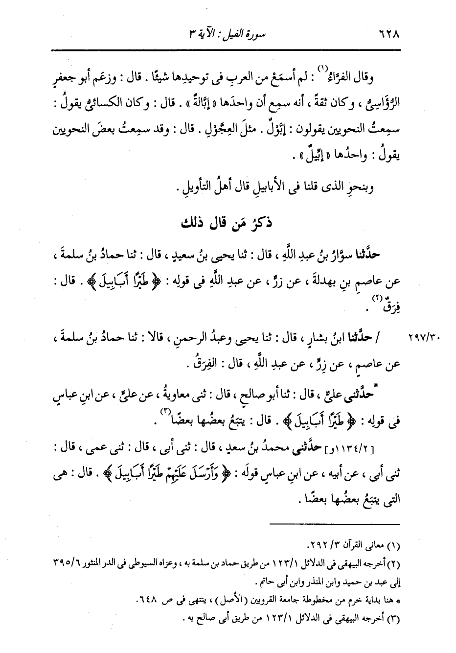 ذِكْرُ مَنْ قَالَ ذَلِكَ حَدَّثَنَا سَوَّارُ بْنُ عَبْدِ اللَّهِ، قَالَ: ثنا يَحْيَى بْنُ سَعِيدٍ، قَالَ: ثنا حَمَّادُ بْنُ سَلَمَةَ، عَنْ عَاصِمِ بْنِ بَهْدَلَةَ، عَنْ زِرٍّ، عَنْ عَبْدِ اللَّهِ، فِي قَوْلِهِ: " {§طَيْرًا أَبَابِيلَ} [الفيل: 3] قَالَ: فِرَقٌ "