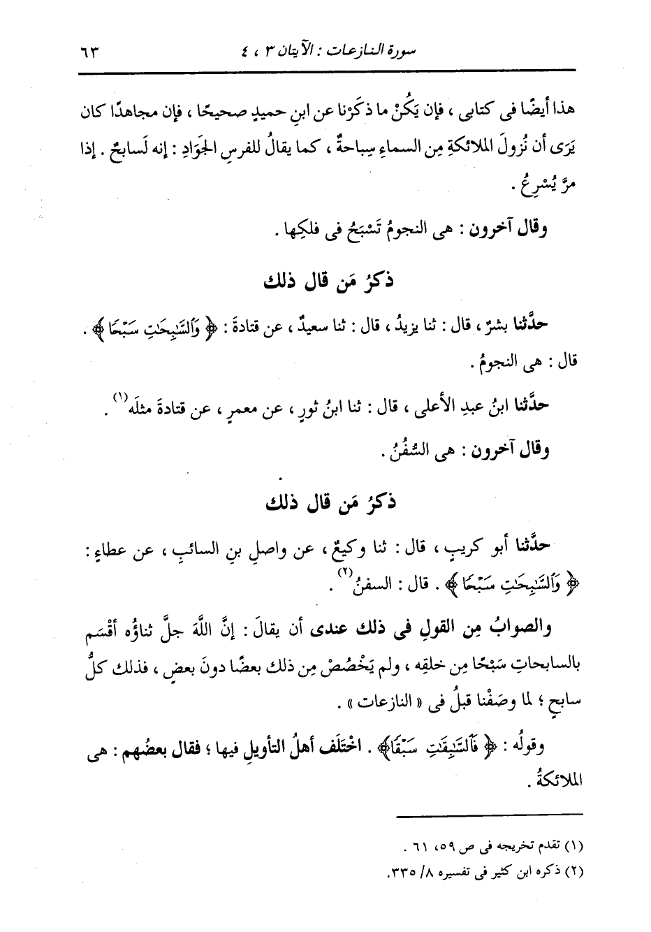 ذِكْرُ مَنْ قَالَ ذَلِكَ: حَدَّثَنَا أَبُو كُرَيْبٍ، قَالَ: ثنا وَكِيعٌ، عَنْ وَاصِلِ بْنِ السَّائِبِ، عَنْ عَطَاءٍ، {§وَالسَّابِحَاتِ سَبْحًا} [النازعات: 3] قَالَ: السُّفُنُ وَالصَّوَابُ مِنَ الْقَوْلِ فِي ذَلِكَ عِنْدِي أَنْ يُقَالَ: إِنَّ اللَّهَ جَلَّ ثَنَاؤُهُ أَقْسَمَ بِالسَّابِحَاتِ سَبْحًا مِنْ خَلْقِهِ، وَلَمْ يُخَصِّصْ مِنْ ذَلِكَ بَعْضًا دُونَ بَعْضٍ، فَذَلِكَ كُلُّ سَابِحٍ، لِمَا وَصَفْنَا قَبْلُ فِي النَّازِعَاتِ