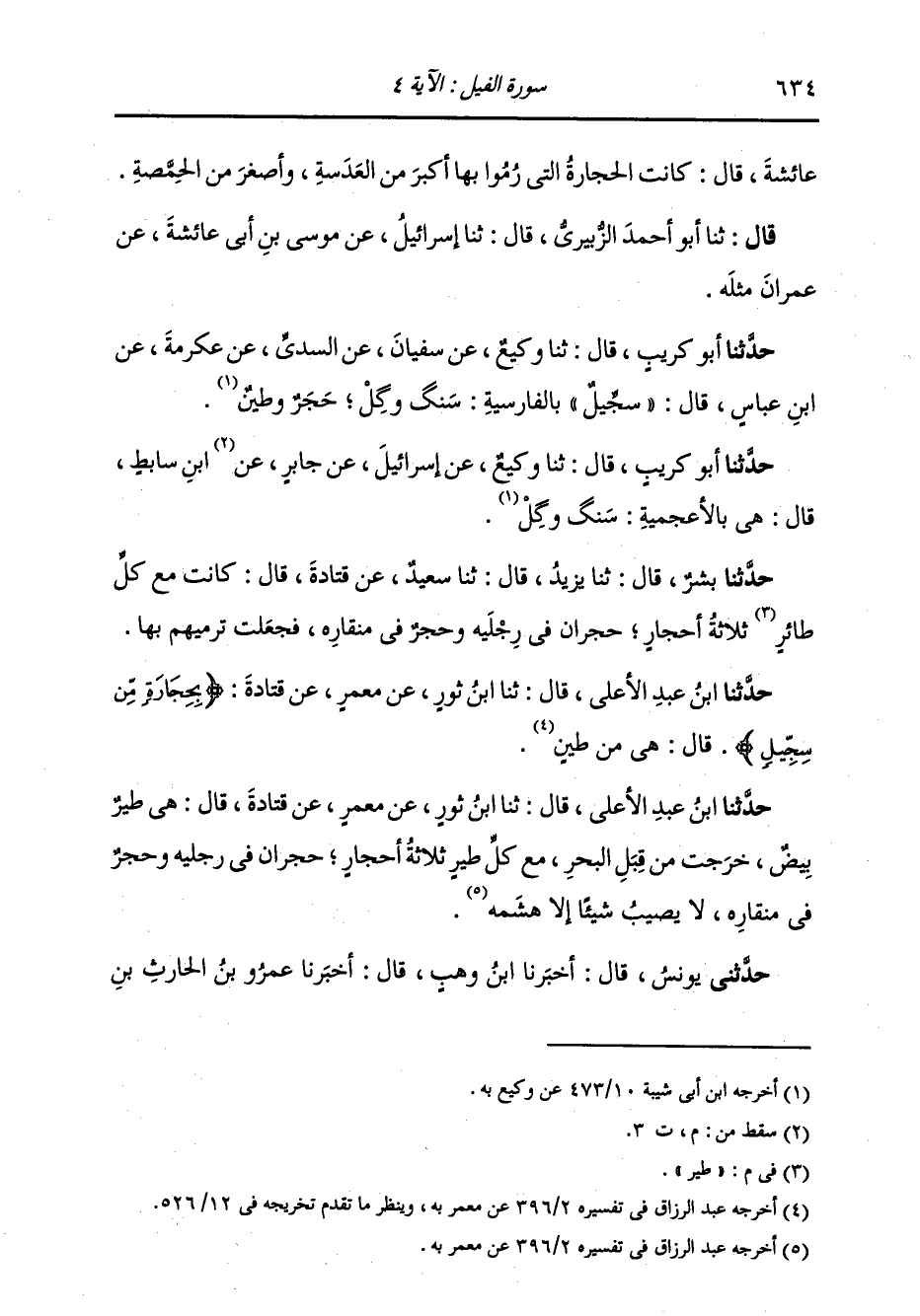 حَدَّثَنَا بِشْرٌ، قَالَ: ثنا يَزِيدُ، قَالَ: ثنا سَعِيدٌ، عَنْ قَتَادَةَ، قَالَ: " §كَانَتْ مَعَ كُلِّ طَيْرٍ ثَلَاثَةُ أَحْجَارٍ: حَجَرَانِ فِي رِجْلَيْهِ، وَحَجَرٌ فِي مِنْقَارِهِ، فَجَعَلَتْ تَرْمِيهِمْ بِهَا "