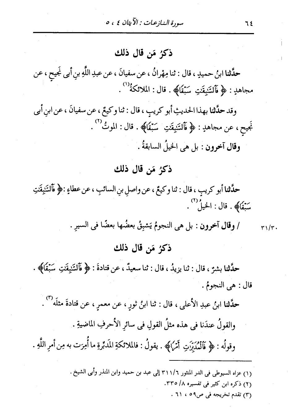 ذِكْرُ مَنْ قَالَ ذَلِكَ: حَدَّثَنَا بِشْرٌ، قَالَ: ثنا يَزِيدُ، قَالَ: ثنا سَعِيدٌ، عَنْ قَتَادَةَ {§فَالسَّابِقَاتِ سَبْقًا} [النازعات: 4] قَالَ: هِيَ النُّجُومُ حَدَّثَنَا ابْنُ عَبْدِ الْأَعْلَى، قَالَ: ثنا ابْنُ ثَوْرٍ، عَنْ مَعْمَرٍ، عَنْ قَتَادَةَ مِثْلَهُ وَالْقَوْلُ عِنْدَنَا فِي هَذِهِ، مِثْلُ الْقَوْلِ فِي سَائِرِ الْأَحْرُفِ الْمَاضِيَةِ