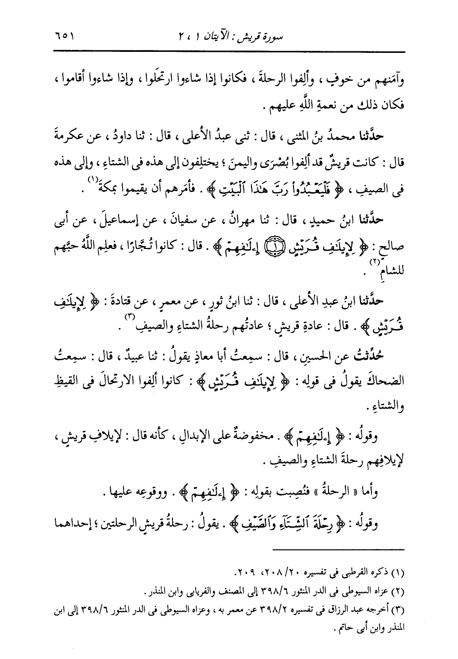 حَدَّثَنَا ابْنُ عَبْدِ الْأَعْلَى، قَالَ ثنا ابْنُ ثَوْرٍ، عَنْ مَعْمَرٍ، عَنْ قَتَادَةَ، " {§لِإِيلَافِ قُرَيْشٍ} [قريش: 1] قَالَ: عَادَةُ قُرَيْشٍ عَادَتُهُمْ رِحْلَةُ الشِّتَاءِ وَالصَّيْفِ "