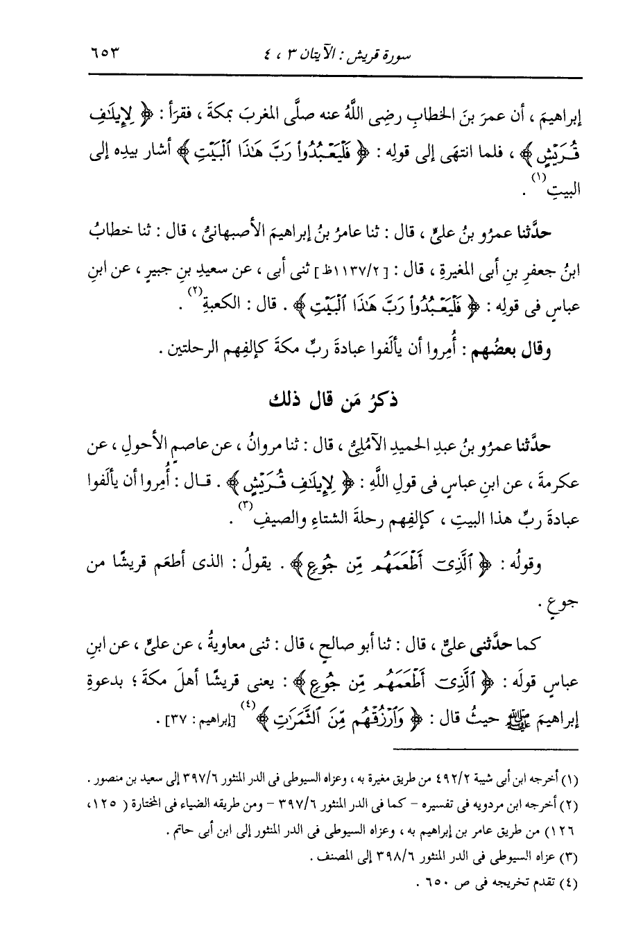 حَدَّثَنَا عَمْرُو بْنُ عَلِيٍّ، قَالَ: ثنا عَامِرُ بْنُ إِبْرَاهِيمَ الْأَصْبَهَانِيُّ، قَالَ: ثنا خَطَّابُ بْنُ جَعْفَرِ بْنِ أَبِي الْمُغِيرَةِ، قَالَ: ثني أَبِي، عَنْ سَعِيدِ بْنِ جُبَيْرٍ، عَنِ ابْنِ عَبَّاسٍ، فِي قَوْلِهِ " {§فَلْيَعْبُدُوا رَبَّ هَذَا الْبَيْتِ} [قريش: 3] قَالَ الْكَعْبَةُ " وَقَالَ بَعْضُهُمْ: أُمِرُوا أَنْ يَأْلَفُوا عِبَادَةَ رَبِّ مَكَّةَ كَإِلْفِهِمُ الرِّحْلَتَيْنِ