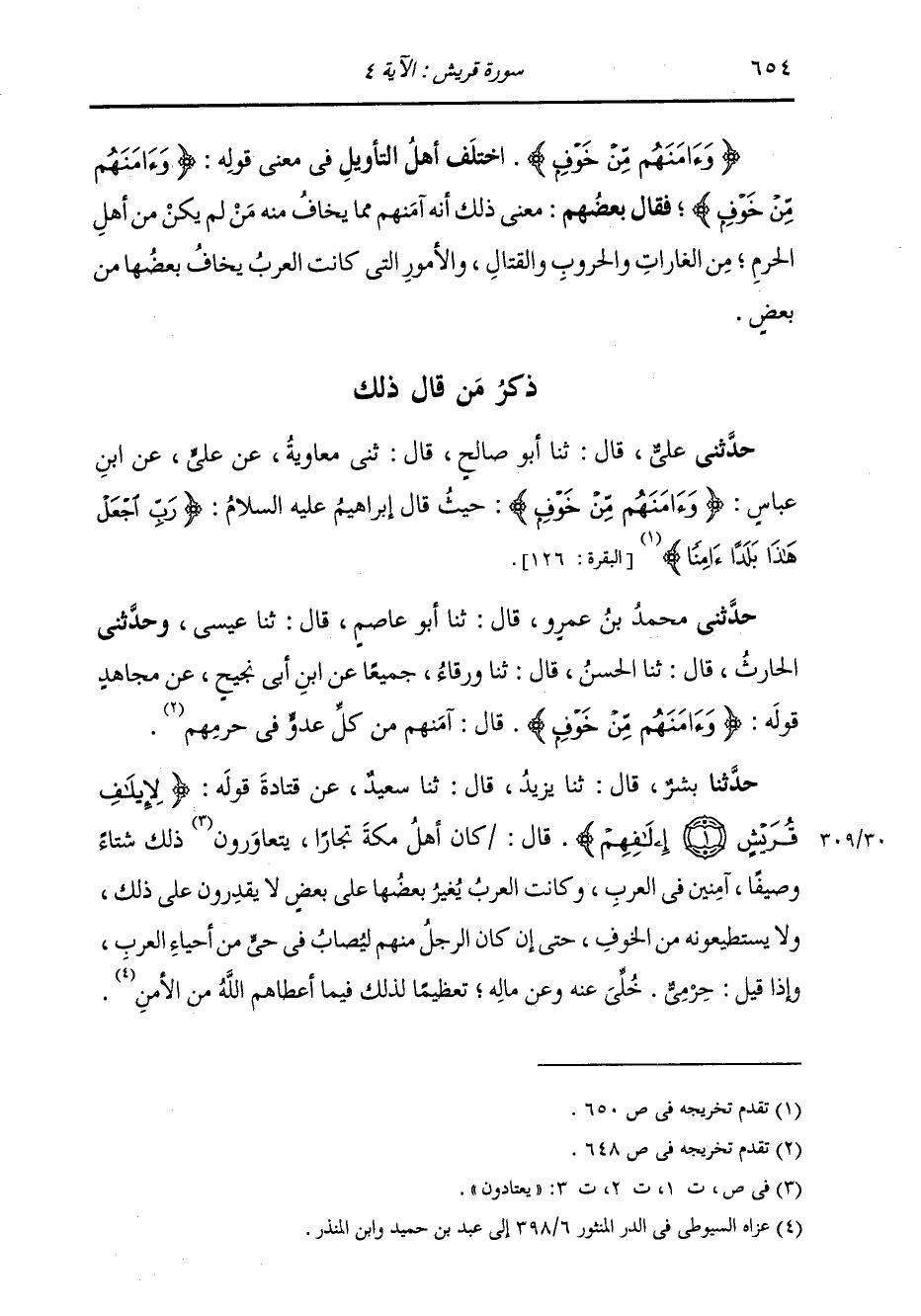 ذِكْرُ مَنْ قَالَ ذَلِكَ حَدَّثَنِي عَلِيٌّ، قَالَ: ثنا أَبُو صَالِحٍ، قَالَ: ثني مُعَاوِيَةُ، عَنْ عَلِيٍّ، عَنِ ابْنِ عَبَّاسٍ " {§وَآمَنَهُمْ مِنْ خَوْفٍ} [قريش: 4] حَيْثُ قَالَ إِبْرَاهِيمُ عَلَيْهِ السَّلَامُ: {رَبِّ اجْعَلْ هَذَا الْبَلَدَ آمِنًا} [إبراهيم: 35] "