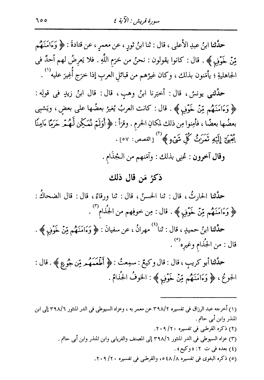 حَدَّثَنِي يُونُسُ، قَالَ: أَخْبَرَنَا ابْنُ وَهْبٍ، قَالَ: قَالَ ابْنُ زَيْدٍ، فِي قَوْلِهِ: {§وَآمَنَهُمْ مِنْ خَوْفٍ} [قريش: 4] قَالَ: كَانَتِ الْعَرَبُ يُغِيرُ بَعْضُهَا عَلَى بَعْضٍ، وَيَسْبِي بَعْضُهَا بَعْضًا، فَأَمِنُوا مِنْ ذَلِكَ لِمَكَانِ الْحَرَمِ، وَقَرَأَ: {أَوَلَمْ نُمَكِّنْ لَهُمْ حَرَمًا آمَنَّا يُجْبَى إِلَيْهِ ثَمَرَاتُ كُلِّ شَيْءٍ} [القصص: 57] " وَقَالَ آخَرُونَ: عُنِيَ بِذَلِكَ: وَآمَنَهُمْ مِنَ الْجُذَامِ