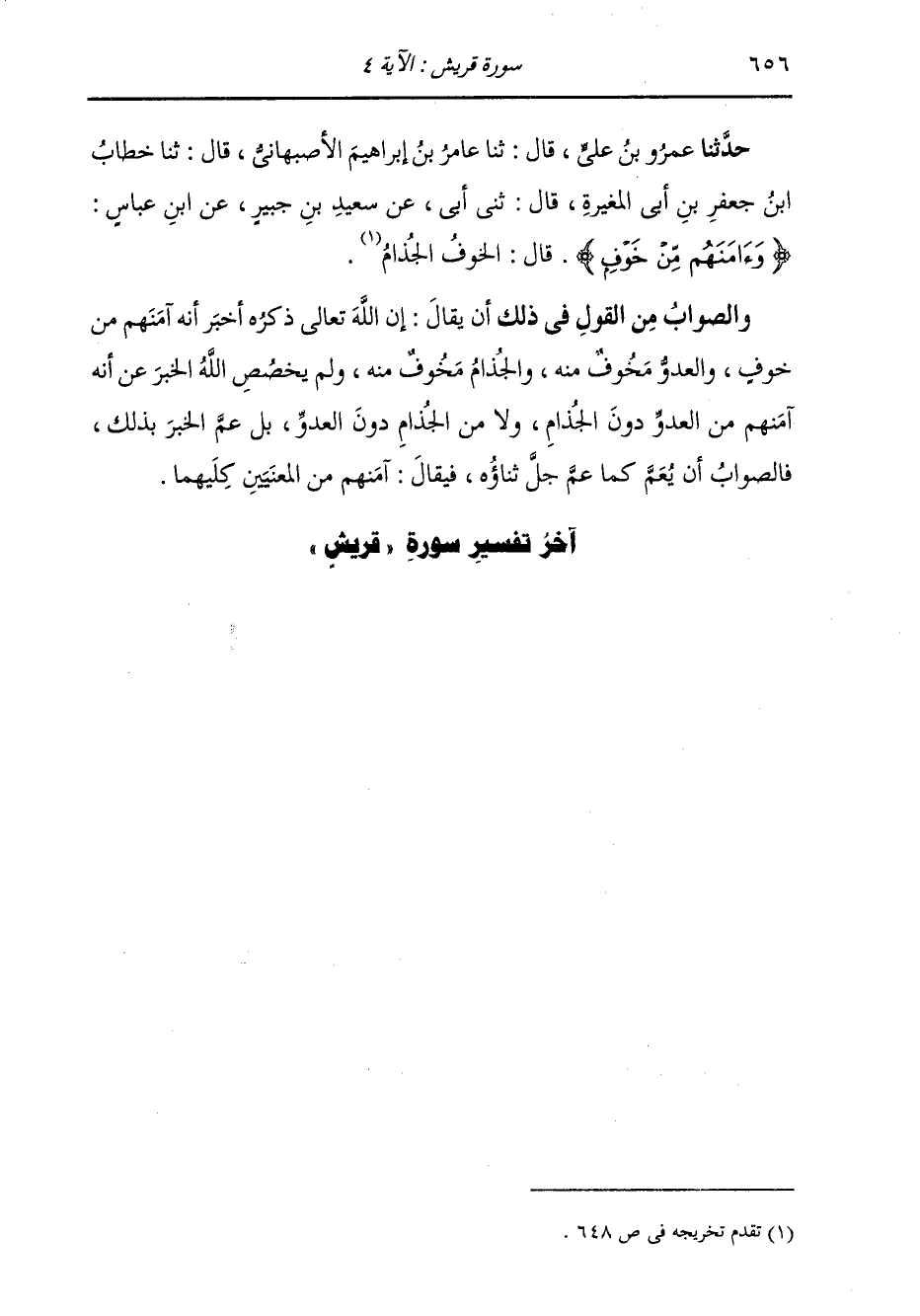 حَدَّثَنَا عَمْرُو بْنُ عَلِيٍّ، قَالَ: ثنا عَامِرُ بْنُ إِبْرَاهِيمَ الْأَصْبَهَانِيُّ، قَالَ: ثنا خَطَّابُ بْنُ جَعْفَرِ بْنِ أَبِي الْمُغِيرَةِ، قَالَ: ثني أَبِي، عَنْ سَعِيدِ بْنِ جُبَيْرٍ، عَنِ ابْنِ عَبَّاسٍ، {§وَآمَنَهُمْ مِنْ خَوْفٍ} [قريش: 4] قَالَ: " الْخَوْفُ: الْجُذَامُ " وَالصَّوَابُ مِنَ الْقَوْلِ فِي ذَلِكَ أَنْ يُقَالَ: إِنَّ اللَّهَ تَعَالَى ذِكْرُهُ أَخْبَرَ أَنَّهُ {آمَنَهُمْ مِنْ خَوْفٍ} [قريش: 4] وَالْعَدُوُّ مَخُوفٌ مِنْهُ، وَالْجُذَامُ مَخُوفٌ مِنْهُ، وَلَمْ يُخَصِّصِ اللَّهُ الْخَبَرَ عَنْ أَنَّهُ آمَنَهُمْ مِنَ الْعَدُوِّ دُونَ الْجُذَامِ، وَلَا مِنَ الْجُذَامِ دُونَ الْعَدُوِّ، بَلْ عَمَّ الْخَبَرَ بِذَلِكَ؛ فَالصَّوَابُ أَنْ يَعُمَّ كَمَا عَمَّ جَلَّ ثَنَاؤُهُ، فَيُقَالَ: أَمَّنَهُمْ مِنَ الْمَعْنَيَيْنِ كِلَيْهِمَا