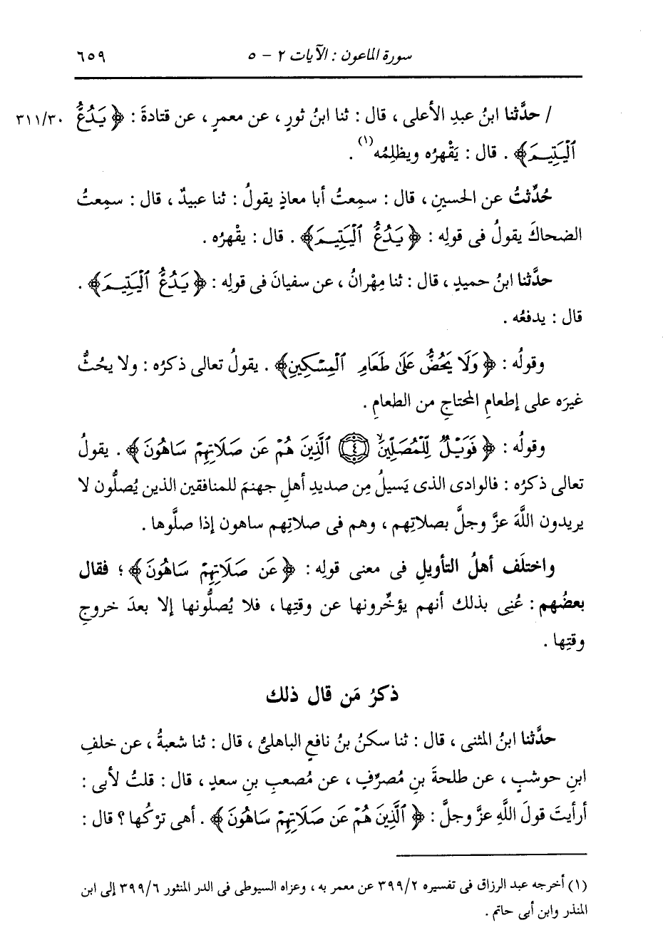 حَدَّثَنَا ابْنُ حُمَيْدٍ، قَالَ: ثنا مِهْرَانُ، عَنْ سُفْيَانَ، فِي قَوْلِهِ: {§يَدُعُّ الْيَتِيمَ} [الماعون: 2] قَالَ: «يَدْفَعُهُ»
