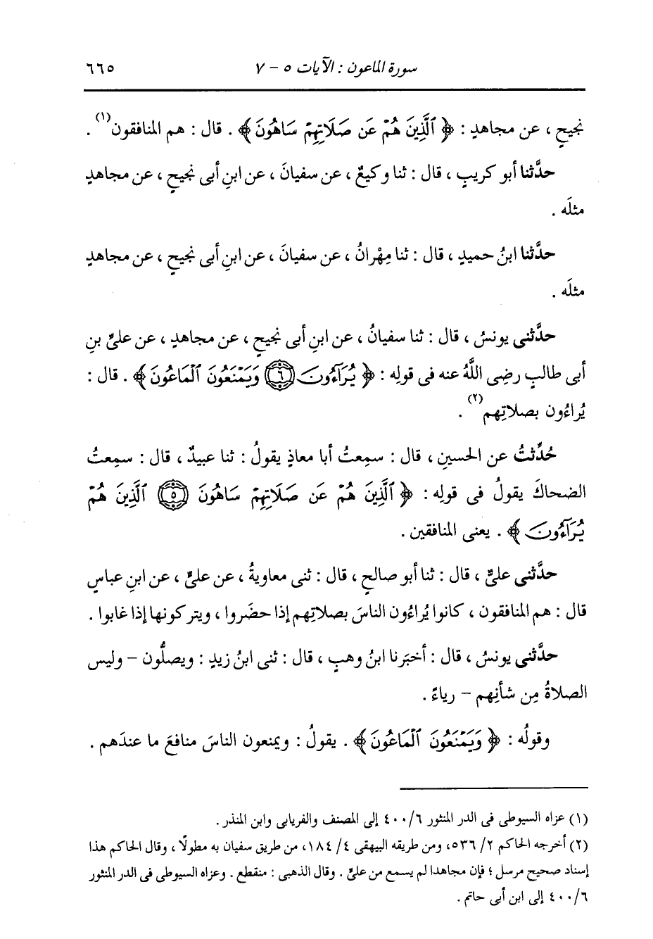 حَدَّثَنِي يُونُسُ، قَالَ: ثنا سُفْيَانُ، عَنِ ابْنِ أَبِي نَجِيحٍ، عَنْ مُجَاهِدٍ، عَنْ عَلِيِّ بْنِ أَبِي طَالِبٍ، عَلَيْهِ السَّلَامُ فِي قَوْلِهِ: §يُرَاءُونَ وَيَمْنَعُونَ الْمَاعُونَ قَالَ: «يُرَاءُونَ بِصَلَاتِهِمْ»