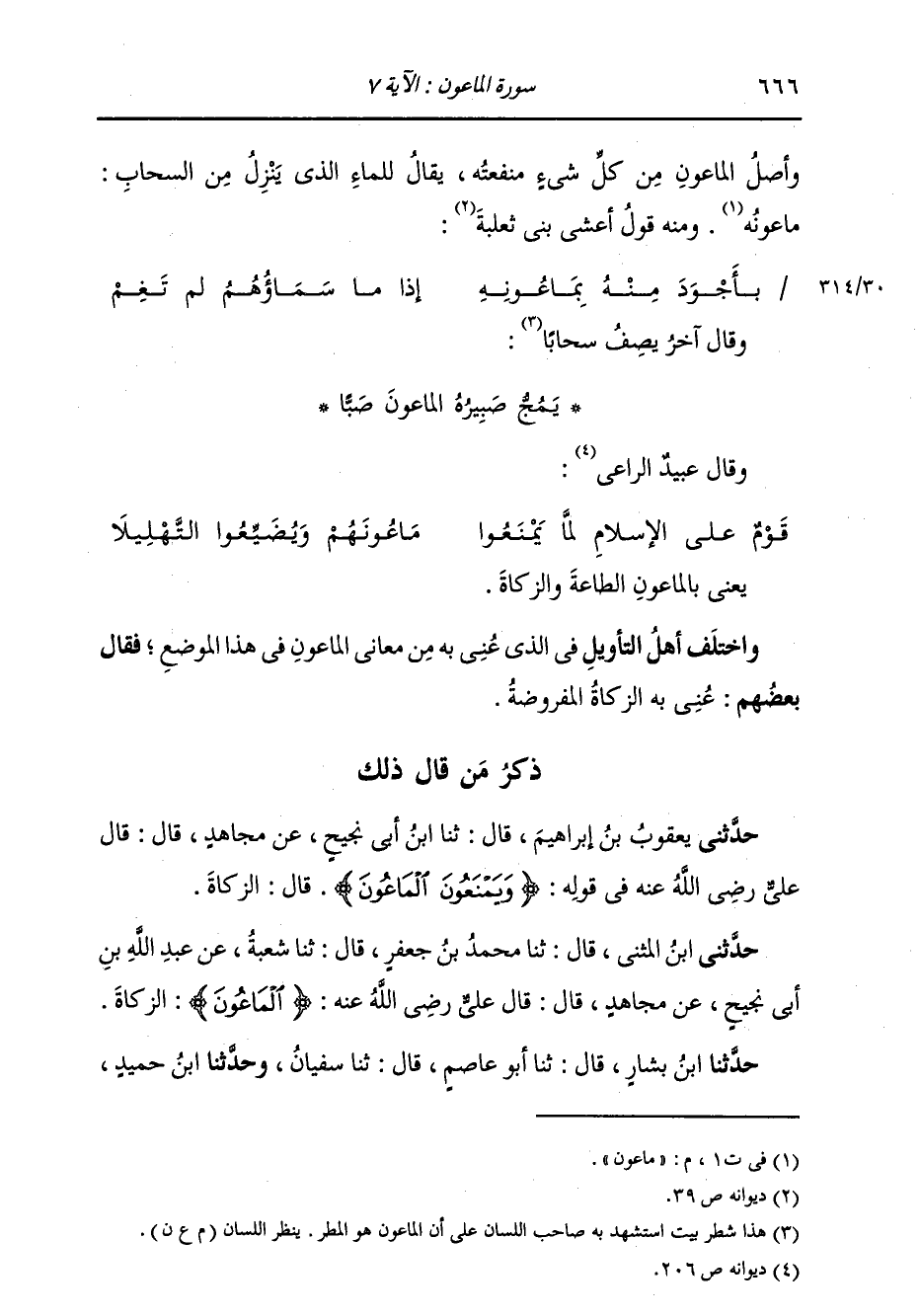 حَدَّثَنِي ابْنُ الْمُثَنَّى، قَالَ: ثنا مُحَمَّدُ بْنُ جَعْفَرٍ، قَالَ: ثنا شُعْبَةُ، عَنْ عَبْدِ اللَّهِ بْنِ أَبِي نَجِيحٍ، عَنْ مُجَاهِدٍ، قَالَ: قَالَ عَلِيٌّ رَضِيَ اللَّهُ عَنْهُ: {§الْمَاعُونَ} [سورة: الماعون، آية رقم: 7] «الزَّكَاةَ»