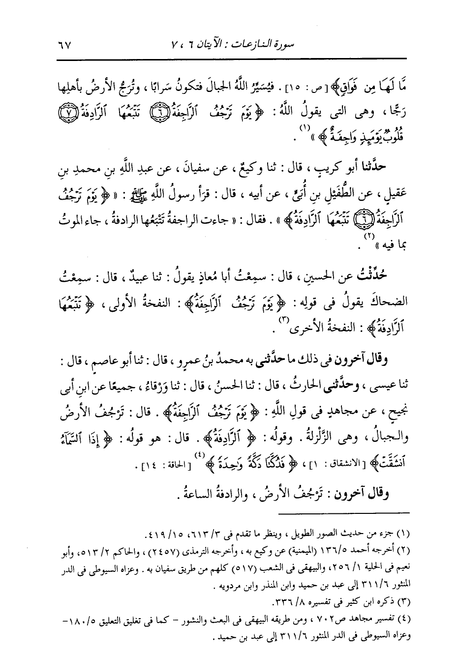 حَدَّثَنِي بِهِ، مُحَمَّدُ بْنُ عَمْرٍو، قَالَ: ثنا أَبُو عَاصِمٍ، قَالَ: ثنا عِيسَى، وَحَدَّثَنِي الْحَارِثُ، قَالَ: ثنا الْحَسَنُ، قَالَ: ثنا وَرْقَاءُ، جَمِيعًا عَنِ ابْنِ أَبِي نَجِيحٍ، عَنْ مُجَاهِدٍ، فِي قَوْلِ اللَّهِ: {§يَوْمَ تَرْجُفُ} [النازعات: 6] الرَّاجِفَةُ قَالَ: تَرْجُفُ الْأَرْضُ وَالْجِبَالُ، وَهِيَ الزَّلْزَلَةُ. وَقَوْلُهُ: {الرَّادِفَةُ} [النازعات: 7] قَالَ: هُوَ قَوْلُهُ: {إِذَا السَّمَاءُ انْشَقَّتْ} [الانشقاق: 1] {فَدُكَّتَا دَكَّةً وَاحِدَةً} [الحاقة: 14] وَقَالَ آخَرُونَ: تَرْجُفُ الْأَرْضُ، وَالرَّادِفَةُ: السَّاعَةُ