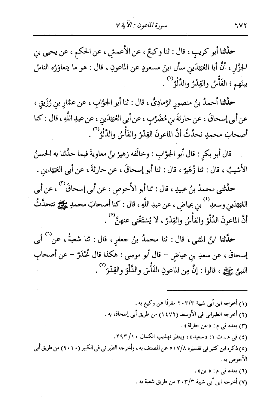 حَدَّثَنَا بِهِ الْحَسَنُ الْأَشْيَبُ، قَالَ: ثنا زُهَيْرٌ، قَالَ: ثنا أَبُو إِسْحَاقَ، عَنْ حَارِثَةَ، عَنْ أَبِي الْعُبَيْدَيْنِ، حَدَّثَنِي مُحَمَّدُ بْنُ عُبَيْدٍ، قَالَ: ثنا أَبُو الْأَحْوَصِ، عَنْ أَبِي إِسْحَاقَ، عَنْ حَارِثَةَ، عَنْ أَبِي الْعُبَيْدَيْنِ وَسَعِيدِ بْنِ عِيَاضٍ، عَنْ عَبْدِ اللَّهِ، قَالَ: " كُنَّا أَصْحَابَ مُحَمَّدٍ صَلَّى اللهُ عَلَيْهِ وَسَلَّمَ §نَتَحَدَّثُ أَنَّ الْمَاعُونَ: الدَّلْوُ وَالْفَأْسُ وَالْقِدْرُ، لَا يُسْتَغْنَى عَنْهُنَّ "