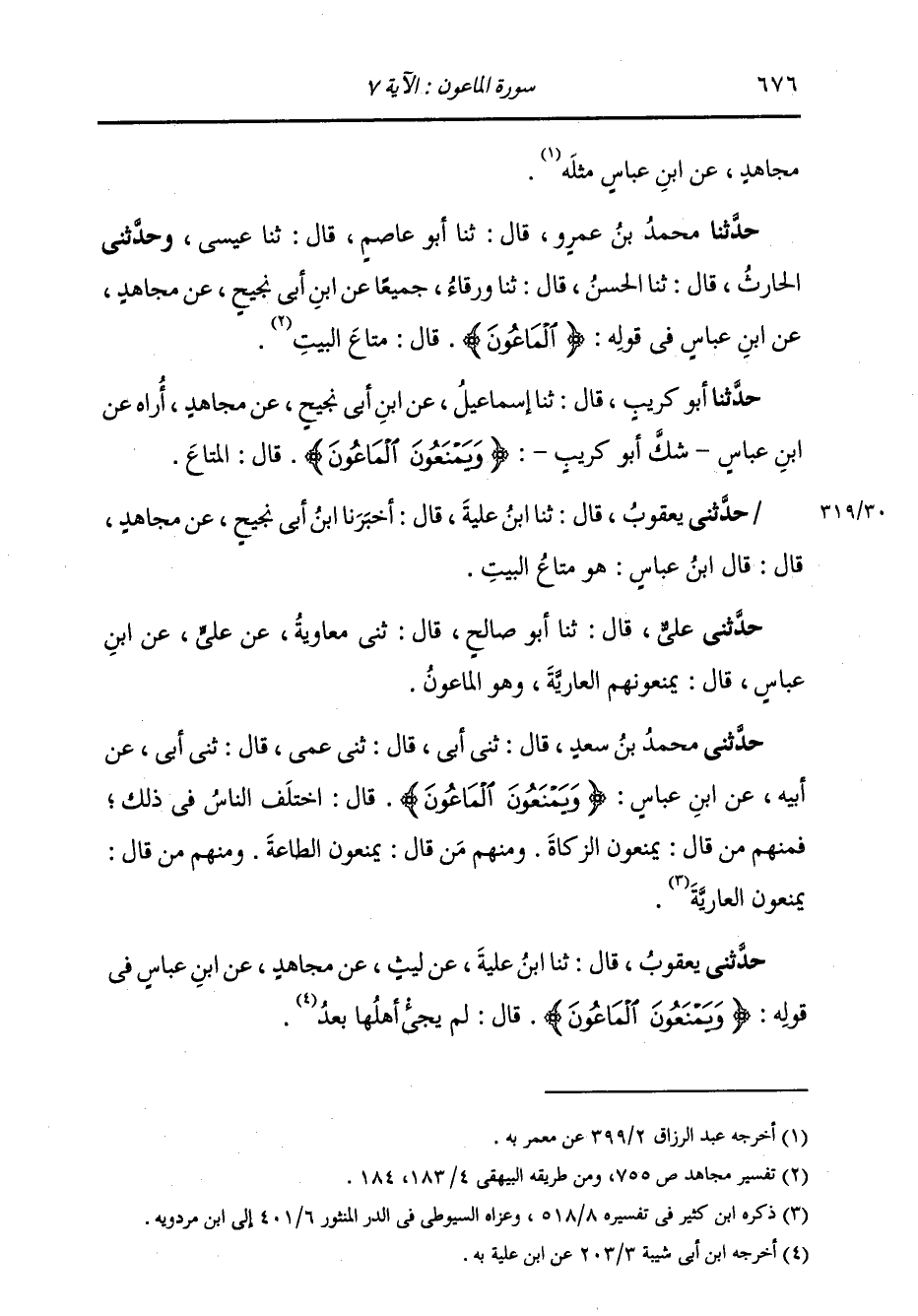 حَدَّثَنِي عَلِيٌّ، قَالَ: ثنا أَبُو صَالِحٍ، قَالَ: ثني مُعَاوِيَةُ، عَنْ عَلِيٍّ، عَنِ ابْنِ عَبَّاسٍ، قَالَ: «§يَمْنَعُونَهُمُ الْعَارِيَةَ، وَهُوَ الْمَاعُونَ»