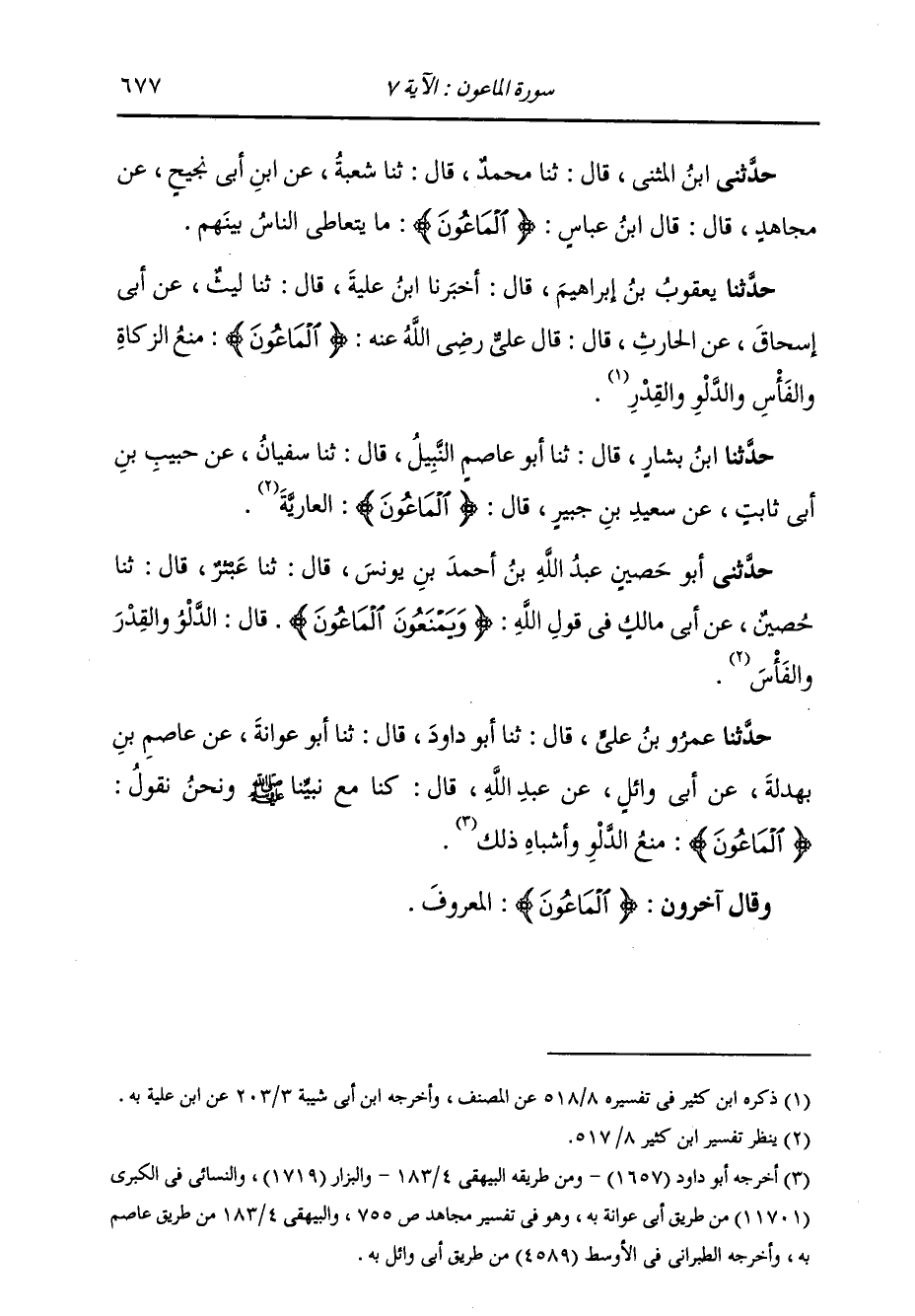 حَدَّثَنَا عَمْرُو بْنُ عَلِيٍّ، قَالَ: ثنا أَبُو دَاوُدَ، قَالَ: ثنا أَبُو عَوَانَةَ، عَنْ عَاصِمِ ابْنِ بَهْدَلَةَ، عَنْ أَبِي وَائِلٍ، عَنْ عَبْدِ اللَّهِ، قَالَ: " §كُنَّا مَعَ نَبِيِّنَا صَلَّى اللهُ عَلَيْهِ وَسَلَّمَ وَنَحْنُ نَقُولُ: {الْمَاعُونُ} [الماعون: 7] : مَنْعُ الدَّلْوِ وَأَشْبَاهِ ذَلِكَ " وَقَالَ آخَرُونَ: الْمَاعُونُ: الْمَعْرُوفُ