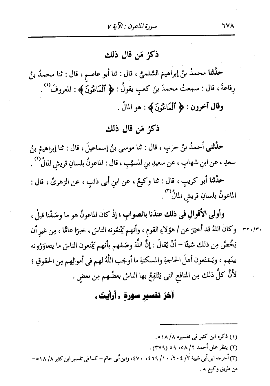 ذِكْرُ مَنْ قَالَ ذَلِكَ حَدَّثَنِي أَحْمَدُ بْنُ حَرْبٍ، قَالَ: ثنا مُوسَى بْنُ إِسْمَاعِيلَ، قَالَ: ثنا إِبْرَاهِيمُ بْنُ سَعْدٍ، عَنِ ابْنِ شِهَابٍ، عَنْ سَعِيدِ بْنِ الْمُسَيِّبِ، قَالَ: " §الْمَاعُونُ، بِلِسَانِ قُرَيْشٍ: الْمَالُ "