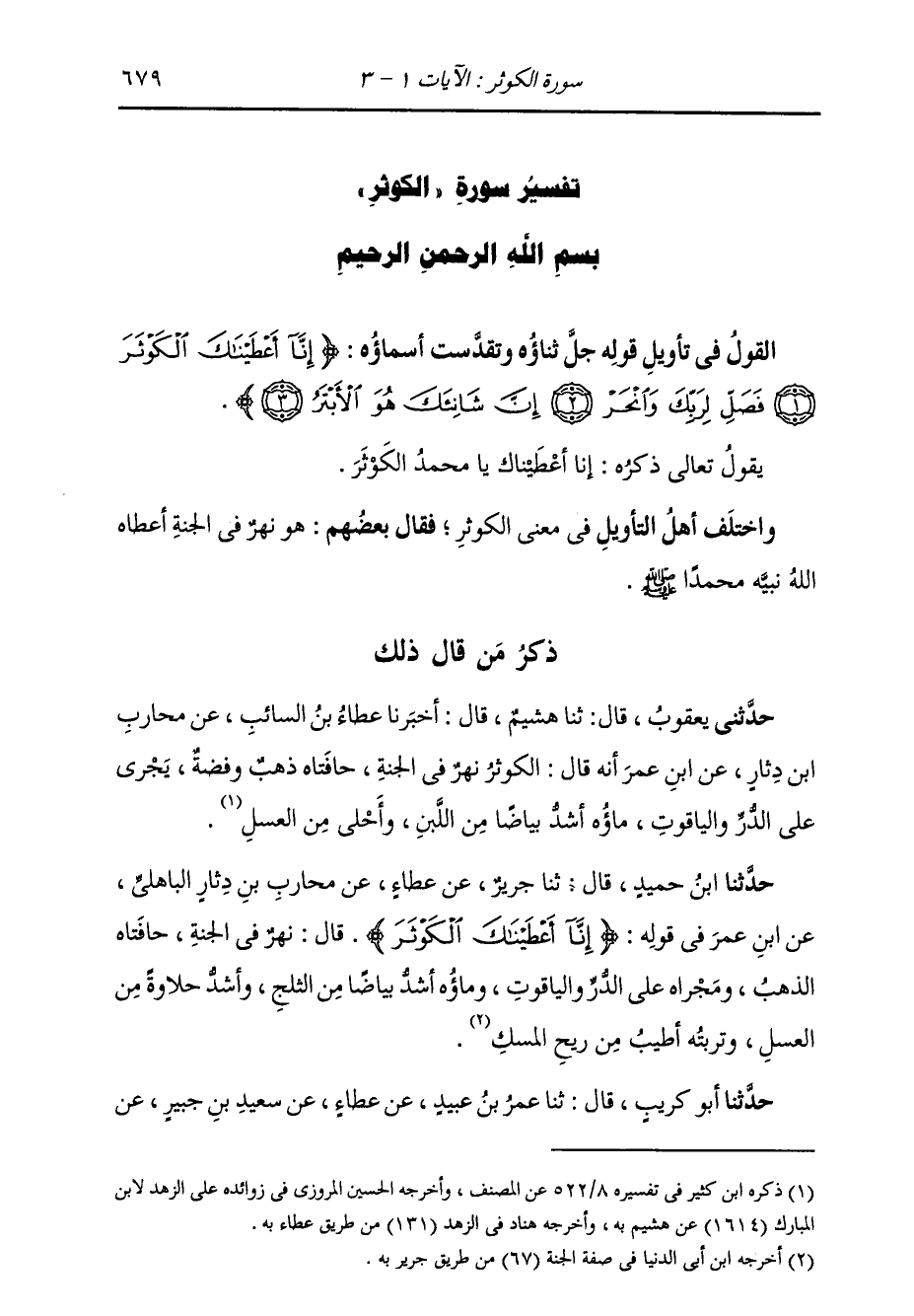 §الْقَوْلُ فِي تَأْوِيلِ قَوْلِهِ تَعَالَى: {إِنَّا أَعْطَيْنَاكَ الْكَوْثَرَ فَصَلِّ لِرَبِّكَ وَانْحَرْ إِنَّ شَانِئَكَ هُوَ الْأَبْتَرُ} [الكوثر: 2] يَقُولُ تَعَالَى ذِكْرُهُ: {إِنَّا أَعْطَيْنَاكَ} [الكوثر: 1] يَا مُحَمَّدُ {الْكَوْثَرَ} [الكوثر: 1] وَاخْتَلَفَ أَهْلُ التَّأْوِيلِ فِي مَعْنَى الْكَوْثَرِ، فَقَالَ بَعْضُهُمْ: هُوَ نَهْرٌ فِي الْجَنَّةِ أَعْطَاهُ اللَّهُ نَبِيَّهُ مُحَمَّدًا صَلَّى اللهُ عَلَيْهِ وَسَلَّمَ