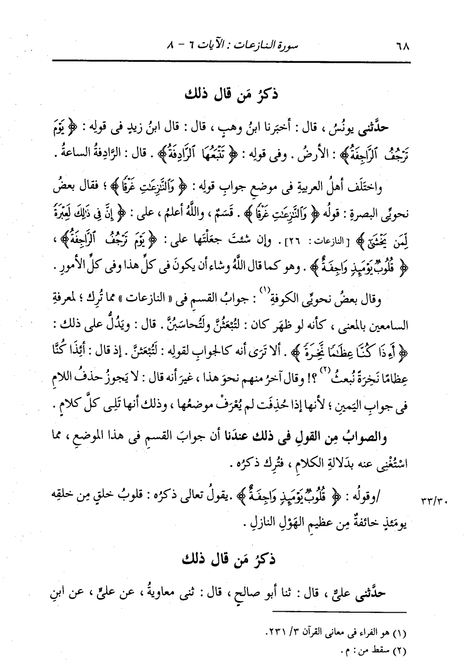 ذِكْرُ مَنْ قَالَ ذَلِكَ: حَدَّثَنِي يُونُسُ، قَالَ: أَخْبَرَنَا ابْنُ وَهْبٍ، قَالَ: قَالَ ابْنُ زَيْدٍ فِي قَوْلِهِ: {§يَوْمَ تَرْجُفُ الرَّاجِفَةُ} [النازعات: 6] الْأَرْضُ، وَفِي قَوْلِهِ: {تَتْبَعُهَا الرَّادِفَةُ} [النازعات: 7] قَالَ: الرَّادِفَةُ: السَّاعَةُ وَاخْتَلَفَ أَهْلُ الْعَرَبِيَّةِ فِي مَوْضِعِ جَوَابِ قَوْلِهِ: {وَالنَّازِعَاتِ غَرْقًا} [النازعات: 1] فَقَالَ بَعْضُ نَحْوِيِّي الْبَصْرَةِ: قَوْلُهُ {وَالنَّازِعَاتِ غَرْقًا} [النازعات: 1] : قَسَمٌ وَاللَّهُ أَعْلَمُ عَلَى {إِنَّ فِيَ ذَلِكَ لَعِبْرَةً لِمَنْ يَخْشَى} [النازعات: 26] وَإِنْ شِئْتَ جَعَلْتَهَا عَلَى {يَوْمَ تَرْجُفُ الرَّاجِفَةُ} [النازعات: 6] {قُلُوبٌ يَوْمَئِذٍ وَاجِفَةٌ} [النازعات: 8] وَهُوَ كَمَا قَالَ اللَّهُ وَشَاءَ أَنْ يَكُونَ فِي كُلِّ هَذَا، وَفِي كُلِّ الْأُمُورِ. وَقَالَ بَعْضُ نَحْوِيِّي الْكُوفَةِ: جَوَابُ الْقَسَمِ فِي النَّازِعَاتِ: مَا تُرِكَ لِمَعْرِفَةِ السَّامِعِينَ بِالْمَعْنَى، كَأَنَّهُ لَوْ ظَهَرَ كَانَ لَتُبْعَثُنَّ وَلَتُحَاسَبُنَّ قَالَ: وَيَدُلُّ عَلَى ذَلِكَ {أَئِذَا كُنَّا عِظَامًا نَخِرَةً} [النازعات: 11] أَلَا تَرَى أَنَّهُ كَالْجَوَابِ لِقَوْلِهِ: {لَتُبْعَثُنَّ} [التغابن: 7] إِذْ قَالَ: {أَئِذَا كُنَّا عِظَامًا نَخِرَةً} [النازعات: 11] وَقَالَ آخَرُ مِنْهُمْ نَحْوَ هَذَا، غَيْرَ أَنَّهُ قَالَ: لَا يَجُوزُ حَذْفُ اللَّامِ فِي جَوَابِ الْيَمِينِ، لِأَنَّهَا إِذَا حُذِفَتْ لَمْ يُعْرَفْ مَوْضِعُهَا، وَذَلِكَ أَنَّهَا تَلِي كُلَّ كَلَامٍ وَالصَّوَابُ مِنَ الْقَوْلِ فِي ذَلِكَ عِنْدَنَا: أَنَّ جَوَابَ الْقَسَمِ فِي هَذَا الْمَوْضِعِ، مِمَّا اسْتُغْنِيَ عَنْهُ بِدَلَالَةِ الْكَلَامِ، فَتُرِكَ ذِكْرُهُ