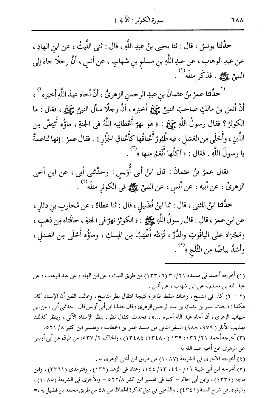 حَدَّثَنَا عُمَرُ بْنُ عُثْمَانَ بْنِ عَبْدِ الرَّحْمَنِ الزُّهْرِيُّ أَنَّ أَخَاهَ عَبْدَ اللَّهِ، أَخْبَرَهُ أَنَّ أَنَسَ بْنَ مَالِكٍ صَاحِبَ النَّبِيِّ صَلَّى اللهُ عَلَيْهِ وَسَلَّمَ أَخْبَرَهُ: أَنَّ رَجُلًا سَأَلَ النَّبِيَّ صَلَّى اللهُ عَلَيْهِ وَسَلَّمَ، فَقَالَ: §مَا الْكَوْثَرُ؟ فَقَالَ رَسُولُ اللَّهِ صَلَّى اللهُ عَلَيْهِ وَسَلَّمَ: «هُوَ نَهْرٌ أَعْطَانِيهِ اللَّهُ فِي الْجَنَّةِ، مَاؤُهُ أَبْيَضُ مِنَ اللَّبَنِ، وَأَحْلَى مِنَ الْعَسَلِ، فِيهِ طُيُورٌ أَعْنَاقُهَا كَأَعْنَاقِ الْجُزُرِ» ، فَقَالَ عُمَرُ: إِنَّهَا لَنَاعِمَةٌ يَا رَسُولَ اللَّهِ، فَقَالَ: «آكِلُهَا أَنْعَمُ مِنْهَا» فَقَالَ: هُوَ عُمَرُ بْنُ عُثْمَانَ: قَالَ ابْنُ أَبِي أُوَيْسٍ؛ وَحَدَّثَنِي أَبِي، عَنِ ابْنِ أَخِي الزُّهْرِيِّ، عَنْ أَبِيهِ، عَنْ أَنَسٍ، عَنِ النَّبِيِّ صَلَّى اللهُ عَلَيْهِ وَسَلَّمَ فِي الْكَوْثَرِ، مِثْلَهُ