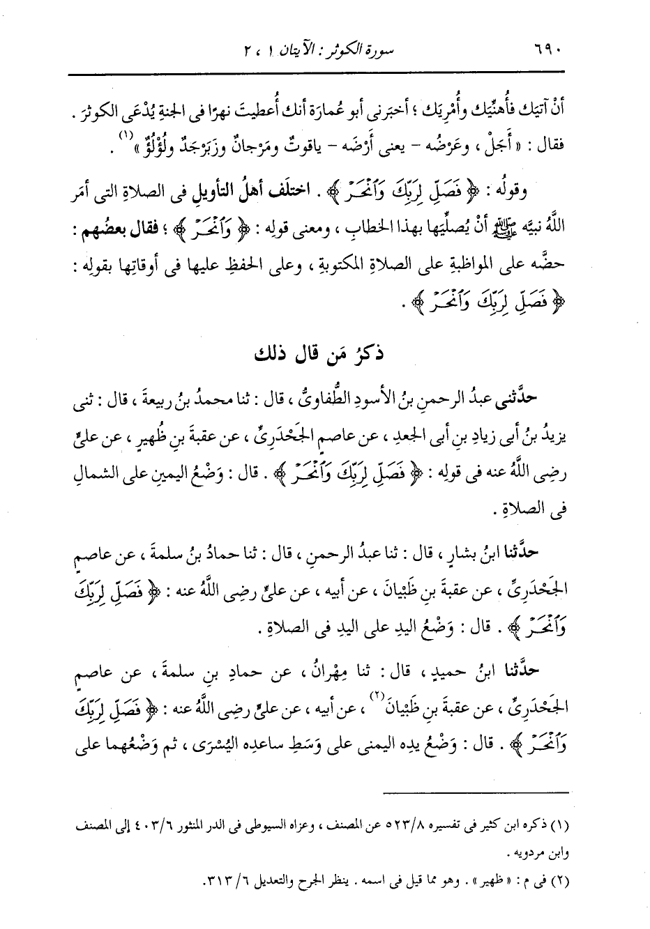 ذِكْرُ مَنْ قَالَ ذَلِكَ حَدَّثَنِي عَبْدُ الرَّحْمَنِ بْنُ الْأَسْوَدِ الطُّفَاوِيُّ، قَالَ: ثنا مُحَمَّدُ بْنُ رَبِيعَةَ، قَالَ: ثني يَزِيدُ بْنُ أَبِي زِيَادِ بْنِ أَبِي الْجَعْدِ، عَنْ عَاصِمٍ الْجَحْدَرِيِّ، عَنْ عُقْبَةَ بْنِ ظُهَيْرٍ، عَنْ عَلِيٍّ، رَضِيَ اللَّهُ عَنْهُ فِي قَوْلِهِ: {فَصَلِّ لِرَبِّكَ §وَانْحَرْ} [الكوثر: 2] قَالَ: «وَضْعُ الْيَمِينِ عَلَى الشِّمَالِ فِي الصَّلَاةِ»