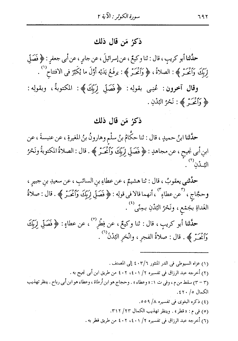 حَدَّثَنِي يَعْقُوبُ، قَالَ: ثنا هُشَيْمٌ، عَنْ عَطَاءِ بْنِ السَّائِبِ، عَنْ سَعِيدِ بْنِ جُبَيْرٍ، وَحَجَّاجٍ، أَنَّهُمَا قَالَا فِي قَوْلِهِ: {فَصَلِّ لِرَبِّكَ وَانْحَرْ} [الكوثر: 2] قَالَ: «§صَلَاةُ الْغَدَاةِ بِجَمْعٍ، وَنَحْرُ الْبُدْنِ بِمِنًى»