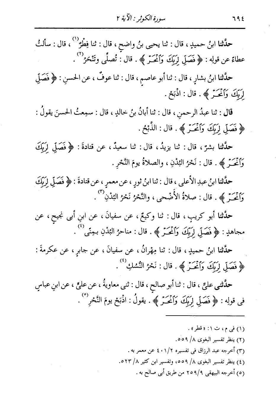 حَدَّثَنِي عَلِيٌّ، قَالَ: ثنا أَبُو صَالِحٍ، قَالَ: ثني مُعَاوِيَةُ، عَنْ عَلِيٍّ، عَنِ ابْنِ عَبَّاسٍ، فِي قَوْلِهِ: {§فَصَلِّ لِرَبِّكَ وَانْحَرْ} [الكوثر: 2] يَقُولُ: «اذْبَحْ يَوْمَ النَّحْرِ»
